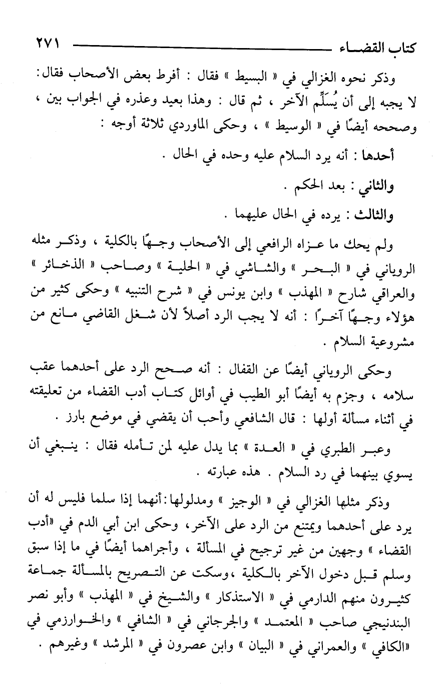 وحكى الروياني أيضًا عن القفال: أنه صحح الرد على أحدهما عقب سلامه، وجزم به أيضًا أبو الطيب في أوائل كتاب أدب القضاء من تعليقته في أثناء مسألة أولها: قال الشافعي وأحب أن يقضي في موضع بارز.