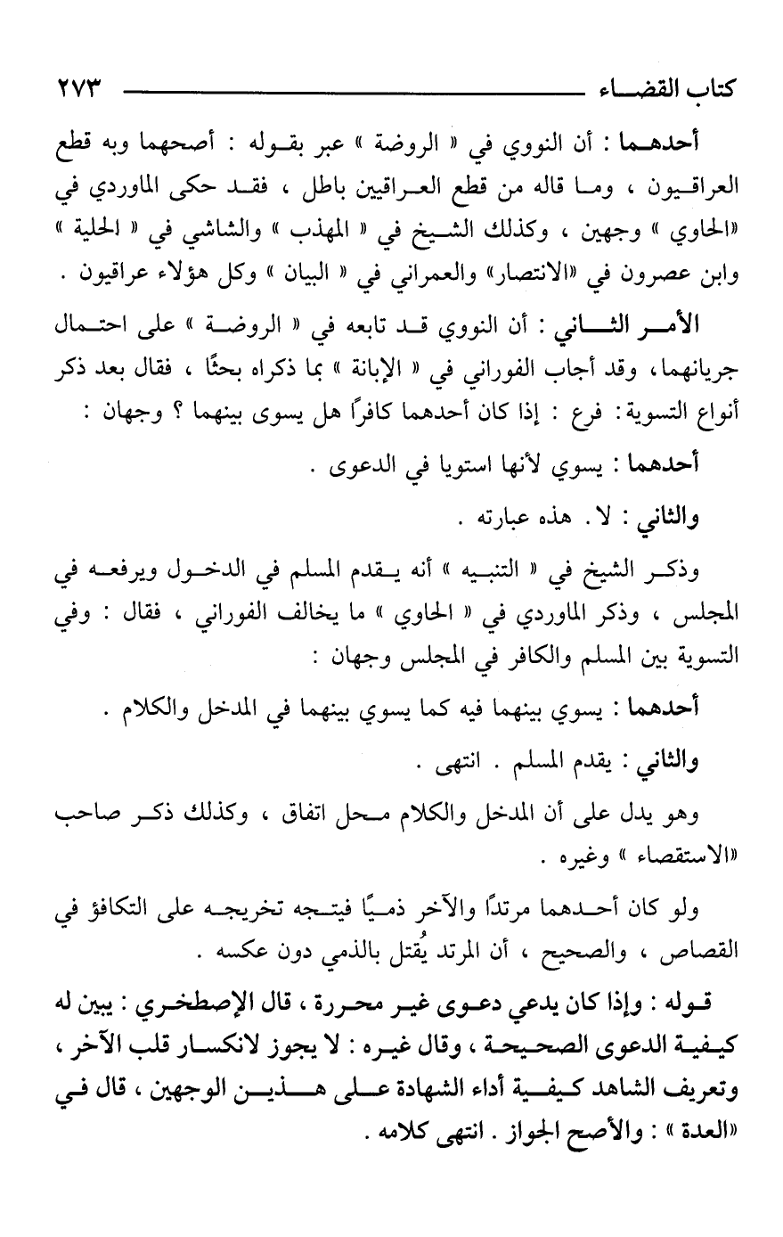 الأمر الثاني: أن النووي قد تابعه في "الروضة" على احتمال جريانهما، وقد أجاب الفوراني في "الإبانة" بما ذكراه بحثًا، فقال بعد ذكر أنواع التسوية: فرع: إذا كان أحدهما كافرًا هل يسوى بينهما؟ وجهان:
