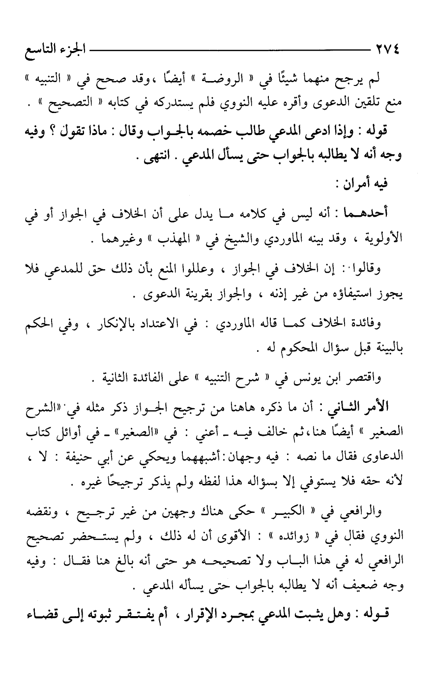 والرافعي في "الكبير" حكى هناك وجهين من غير ترجيح، ونقضه النووي فقال في "زوائده": الأقوى أن له ذلك، ولم يستحضر تصحيح الرافعي له في هذا الباب ولا تصحيحه هو حتى أنه بالغ هنا فقال: وفيه وجه ضعيف أنه لا يطالبه بالجواب حتى يسأله المدعي.
