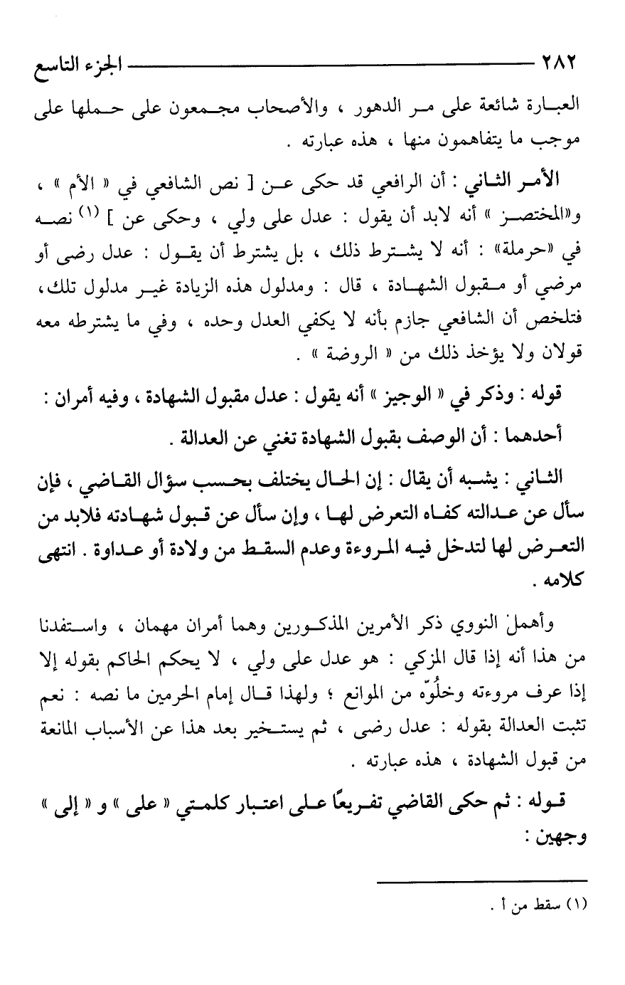 وأهمل النووي ذكر الأمرين المذكورين وهما أمران مهمان، واستفدنا من هذا أنه إذا قال المزكي: هو عدل على ولي، لا يحكم الحاكم بقوله إلا إذا عرف مروءته وخلُوّه من الموانع؛ ولهذا قال إمام الحرمين ما نصه: نعم تثبت العدالة بقوله: عدل رضى، ثم يستخير بعد هذا عن الأسباب المانعة من قبول الشهادة، هذه عبارته.