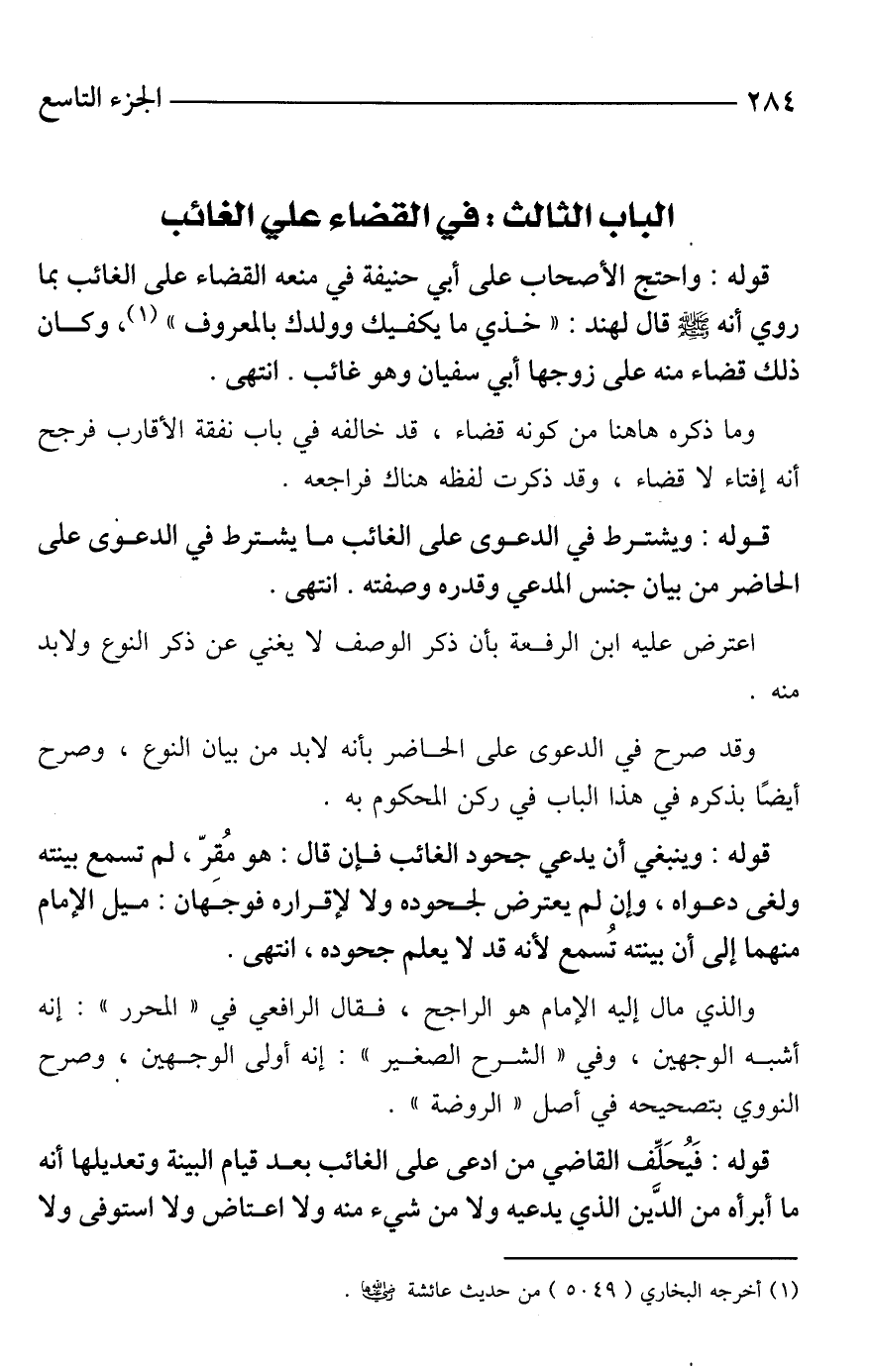 قوله: واحتج الأصحاب على أبي حنيفة في منعه القضاء على الغائب بما روي أنه - صَلَّى اللَّهُ عَلَيْهِ وَسَلَّمَ - قال لهند: "خذي ما يكفيك وولدك بالمعروف" (¬1)، وكان ذلك قضاء منه على زوجها أبي سفيان وهو غائب. انتهى.