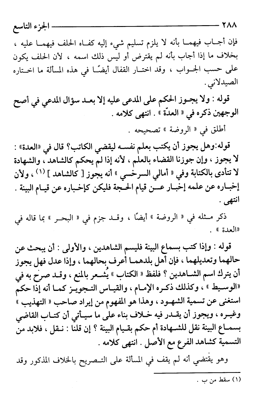 قوله: وهل يجوز أن يكتب بعلم نفسه ليقضي الكاتب؟ قال في "العدة": لا يجوز، وإن جوزنا القضاء بالعلم، لأنه إذا لم يحكم كالشاهد، والشهادة لا تتأدى بالكتابة وفي "أمالي السرخسي" أنه يجوز [كالشاهد] (¬1)، ولأن إخباره عن علمه إخبار عن قيام الحجة فليكن كإخباره عن قيام البينة. انتهى.