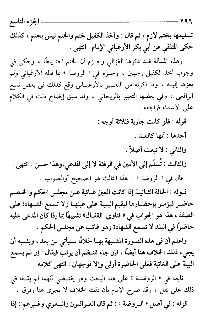 وهذه المسألة قد ذكرها الغزالي وجزم أن الختم احتياطًا، وحكى في وجوب أخذ الكفيل وجهين، وجزم في "الروضة" بما قاله الأرغياني ولم يعزها إليه، وما ذكرته من التعبير بالأرغياني وقع كذلك في بعض نسخ الرافعي، وفي بعضها التعبير بالريحاني، وقد سبق إيضاح ذلك في الكلام على الأسماء فراجعه.