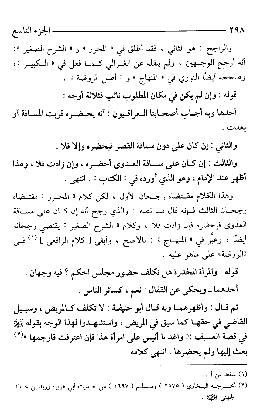وهذا الكلام مقتضاه رجحان الأول، لكن كلام "المحرر" مقتضاه رجحان الثالث فإنه قال ما نصه: والذي رجح أنه إن كان على مسافة العدوى فيحضره فإن زادت فلا، وكلام "الشرح الصغير" يقتضي رجحانه أيضًا، وعبَّر في "المنهاج": بالأصح، وأبقى [كلام الرافعي] (¬1) في "الروضة" على ما هو عليه.