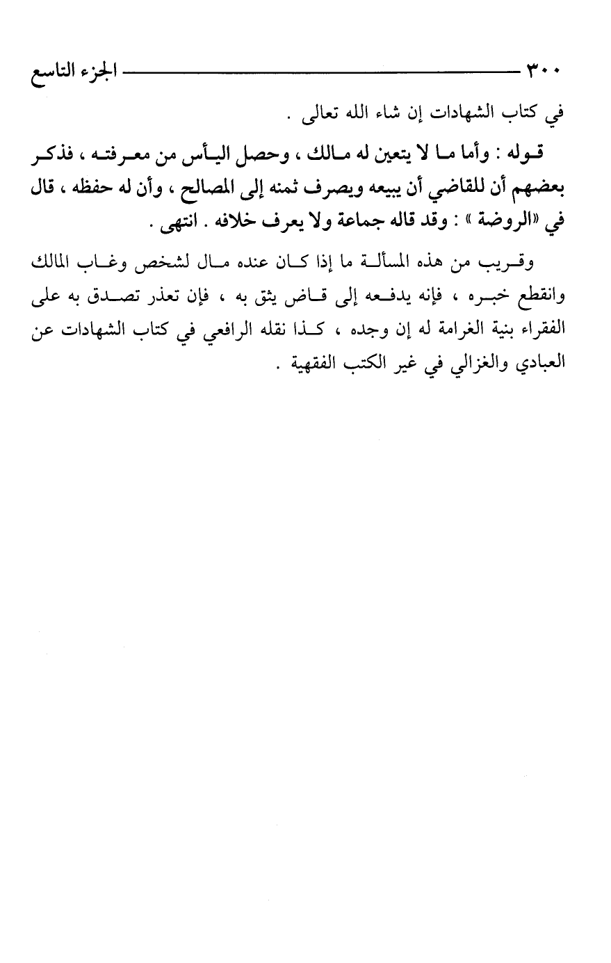 وقريب من هذه المسألة ما إذا كان عنده مال لشخص وغاب المالك وانقطع خبره، فإنه يدفعه إلى قاض يثق به، فإن تعذر تصدق به على الفقراء بنية الغرامة له إن وجده، كذا نقله الرافعي في كتاب الشهادات عن العبادي والغزالي في غير الكتب الفقهية.