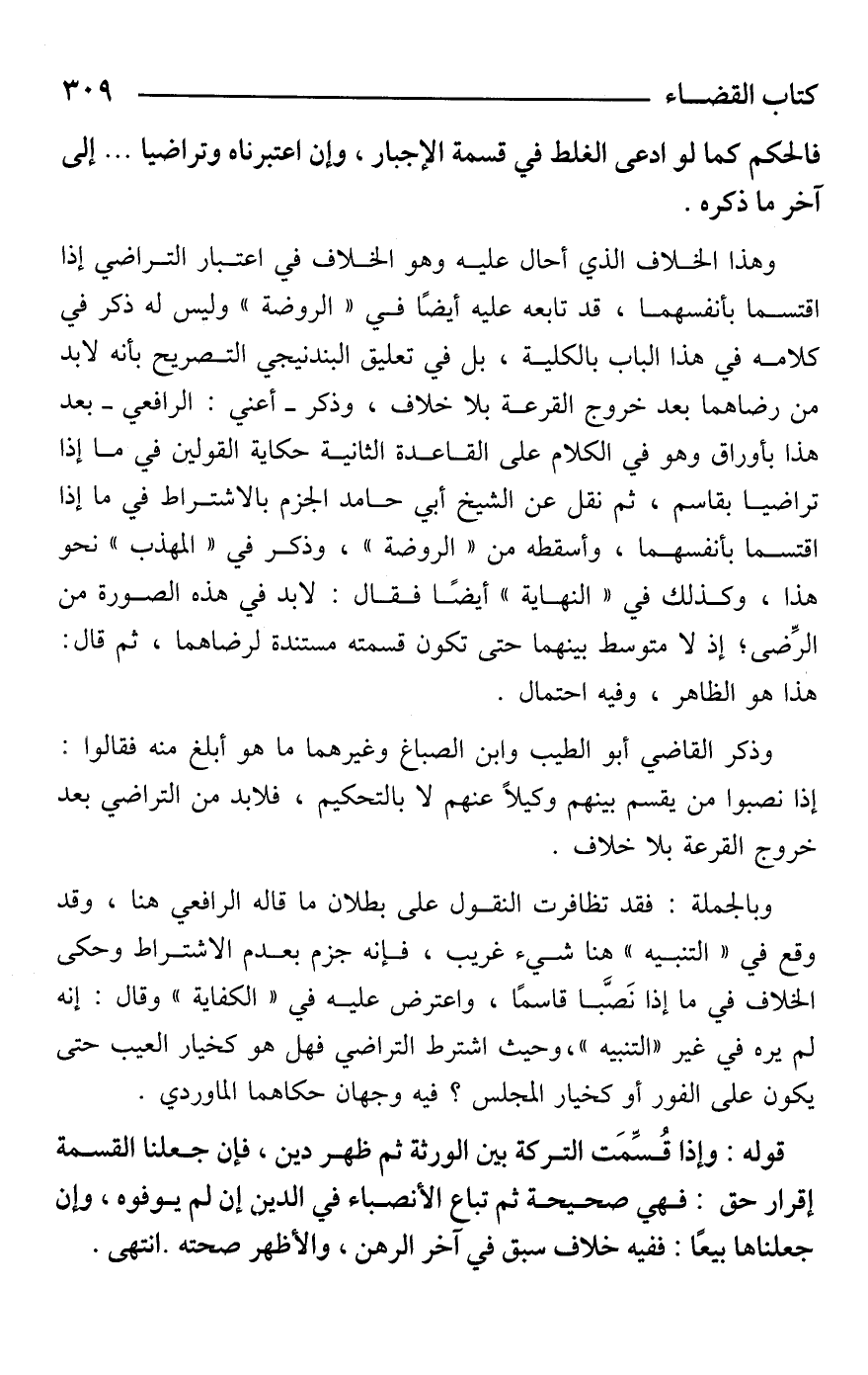 وهذا الخلاف الذي أحال عليه وهو الخلاف في اعتبار التراضي إذا اقتسما بأنفسهما، قد تابعه عليه أيضًا في "الروضة" وليس له ذكر في كلامه في هذا الباب بالكلية، بل في تعليق البندنيجي التصريح بأنه لابد من رضاهما بعد خروج القرعة بلا خلاف، وذكر -أعني: الرافعي- بعد هذا بأوراق وهو في الكلام على القاعدة الثانية حكاية القولين في ما إذا تراضيا بقاسم، ثم نقل عن الشيخ أبي حامد الجزم بالاشتراط في ما إذا اقتسما بأنفسهما، وأسقطه من "الروضة"، وذكر في "المهذب" نحو هذا، وكذلك في "النهاية" أيضًا فقال: لابد في هذه الصورة من الرِّضى؛ إذ لا متوسط بينهما حتى تكون قسمته مستندة لرضاهما، ثم قال: هذا هو الظاهر، وفيه احتمال.