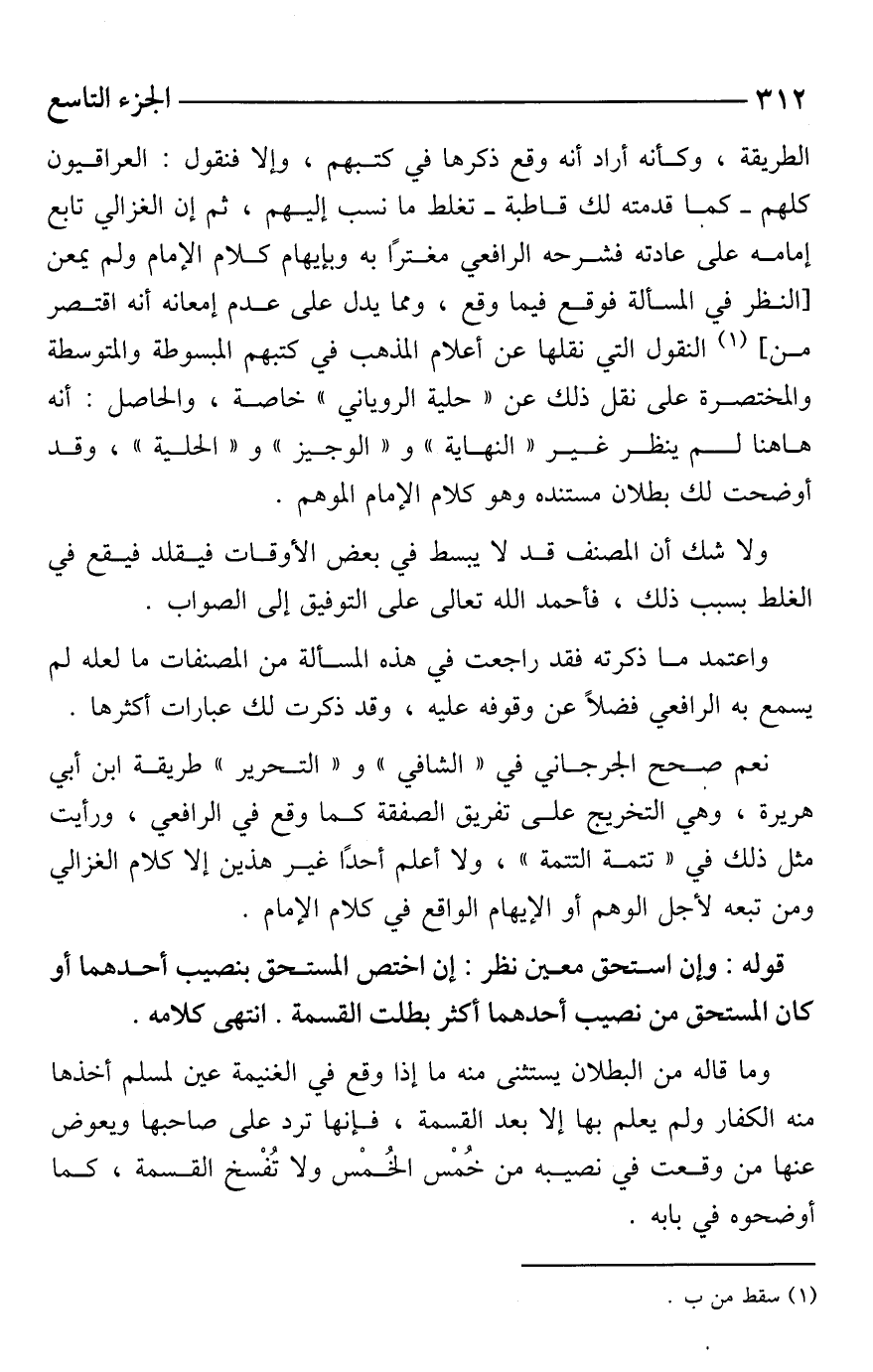 الطريقة، وكأنه أراد أنه وقع ذكرها في كتبهم، وإلا فنقول: العراقيون كلهم -كما قدمته لك قاطبة- تغلط ما نسب إليهم، ثم إن الغزالي تابع إمامه على عادته فشرحه الرافعي مغترًا به وبإيهام كلام الإمام ولم يمعن [النظر في المسألة فوقع فيما وقع، ومما يدل على عدم إمعانه أنه اقتصر من] (¬1) النقول التي نقلها عن أعلام المذهب في كتبهم المبسوطة والمتوسطة والمختصرة على نقل ذلك عن "حلية الروياني" خاصة، والحاصل: أنه هاهنا لم ينظر غير "النهاية" و"الوجيز" و"الحلية"، وقد أوضحت لك بطلان مستنده وهو كلام الإمام الموهم.
