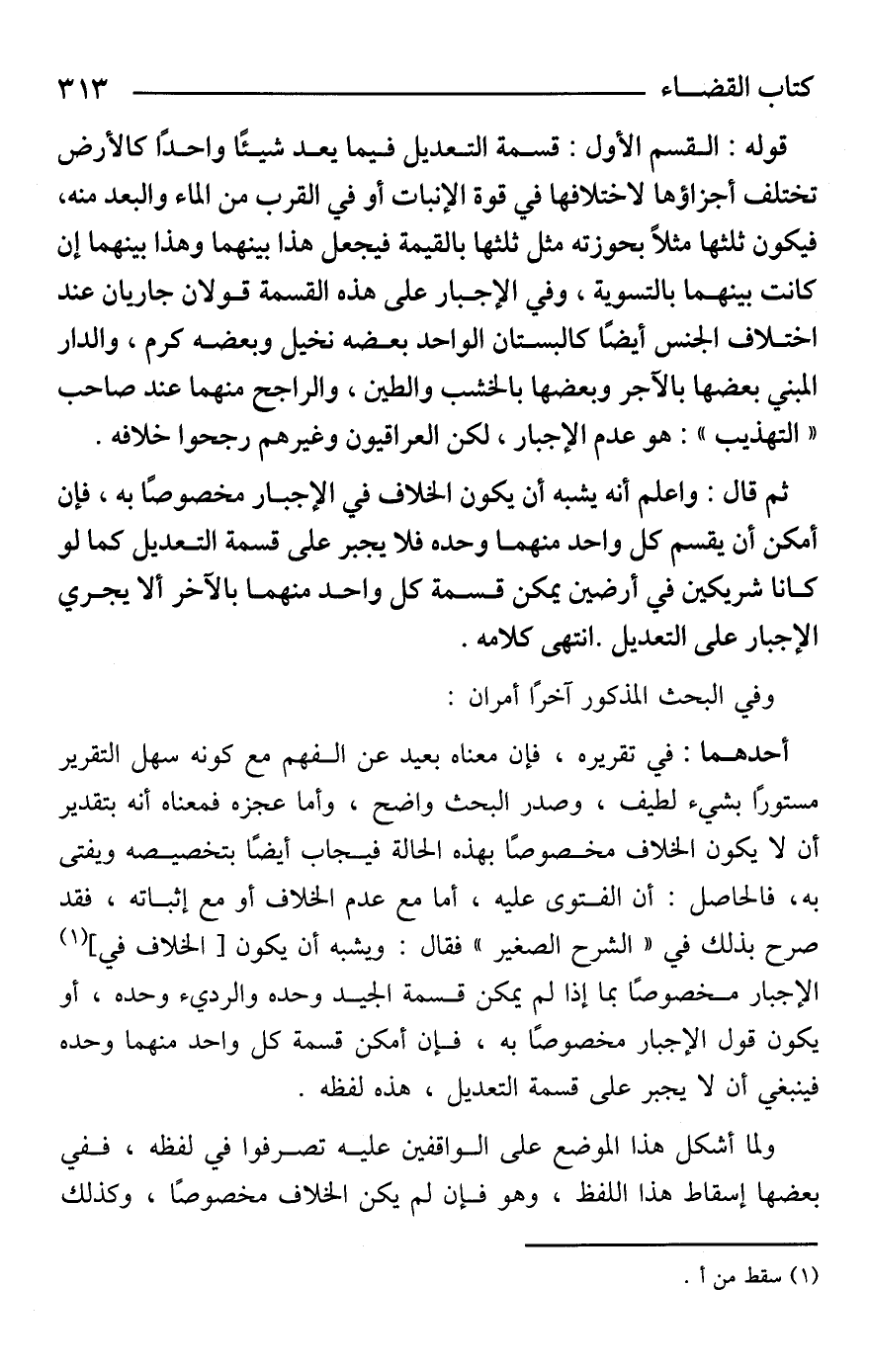 أحدهما: في تقريره، فإن معناه بعيد عن الفهم مع كونه سهل التقرير مستورًا بشيء لطيف، وصدر البحث واضح، وأما عجزه فمعناه أنه بتقدير أن لا يكون الخلاف مخصوصًا بهذه الحالة فيجاب أيضًا بتخصيصه ويفتى به، فالحاصل: أن الفتوى عليه، أما مع عدم الخلاف أو مع إثباته، فقد صرح بذلك في "الشرح الصغير" فقال: ويشبه أن يكون [الخلاف في] (¬1) الإجبار مخصوصًا بما إذا لم يمكن قسمة الجيد وحده والرديء وحده، أو يكون قول الإجبار مخصوصًا به، فإن أمكن قسمة كل واحد منهما وحده فينبغي أن لا يجبر على قسمة التعديل، [هذا] لفظه.