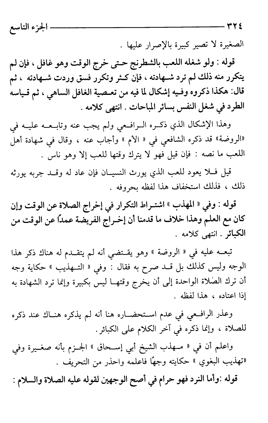 قوله: ولو شغله اللعب بالشطرنج حتى خرج الوقت وهو غافل، فإن لم يتكرر منه ذلك لم ترد شهادته، فإن كثر وتكرر فسق وردت شهادته، ثم قال: هكذا ذكروه وفيه إشكال لما فيه من تعصية الغافل الساهي، ثم قياسه الطرد في شغل النفس بسائر المباحات. انتهى كلامه.