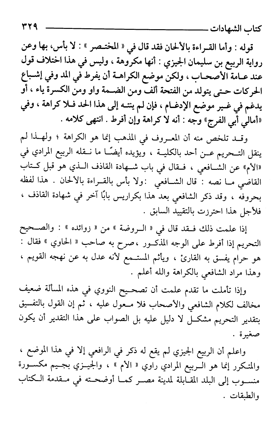 وقد تلخص منه أن المعروف في المذهب إنما هو الكراهة؛ ولهذا لم ينقل التحريم عن أحد بالكلية، ويؤيده أيضًا ما نقله الربيع المرادي في "الأم" عن الشافعي، فقال في باب شهادة القاذف الذي هو قبل كتاب القاضي ما نصه: قال الشافعي: ولا بأس بالقراءة بالألحان. هذا لفظه بحروفه، وقد ذكر الشافعي بعد هذا بكراريس بابًا آخر في شهادة القاذف، فلأجل هذا احترزت بالتقييد السابق.