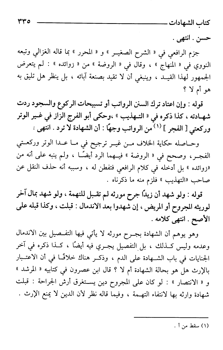قوله: وإن اعتاد ترك السنن الرواتب أو تسبيحات الركوع والسجود ردت شهادته، كذا ذكره في "التهذيب"، وحكى أبو الفرج الزاز في غير الوتر وركعتي [الفجر] (¬1) من الرواتب وجهًا: أن الشهادة لا ترد. انتهى: