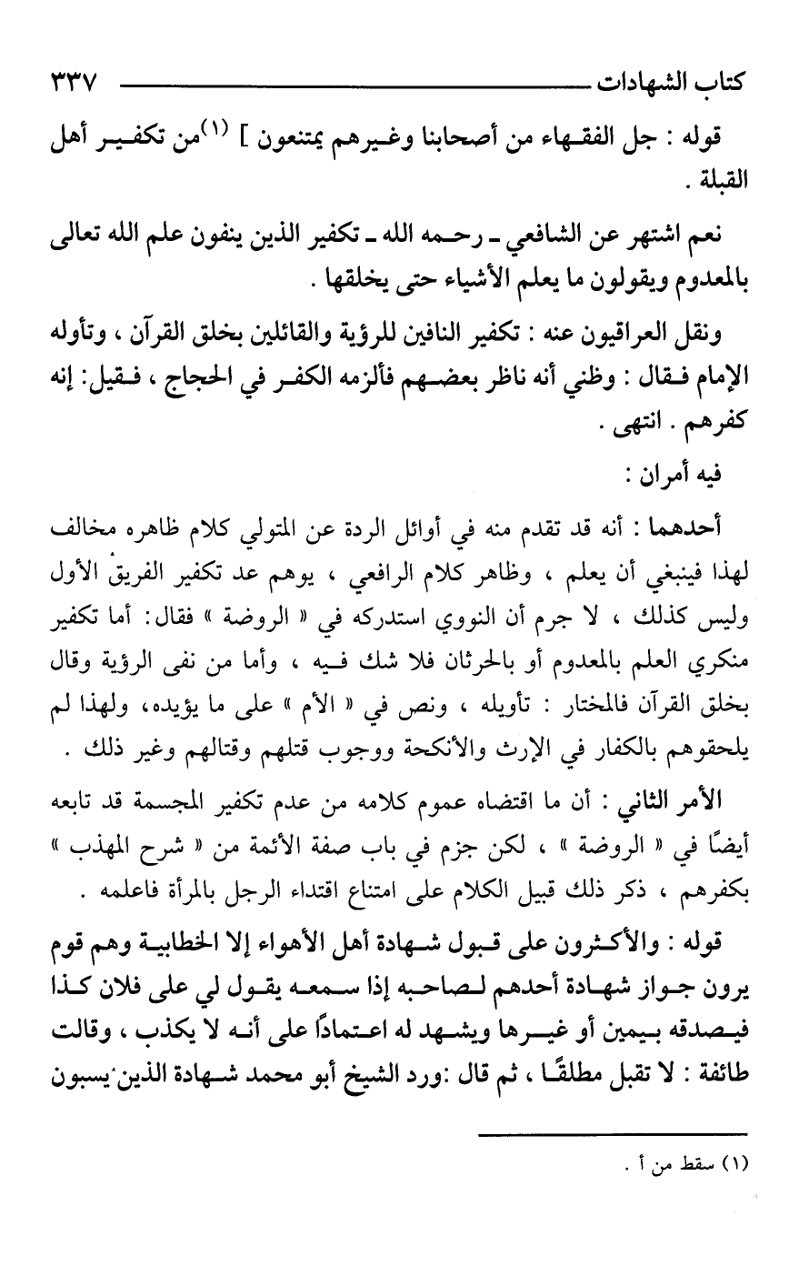 أحدهما: أنه قد تقدم منه في أوائل الردة عن المتولي كلام ظاهره مخالف لهذا فينبغي أن يعلم، وظاهر كلام الرافعي، يوهم عد تكفير الفريق الأول وليس كذلك، لا جرم أن النووي استدركه في "الروضة" فقال: أما تكفير منكري العلم بالمعدوم أو بالحرثان فلا شك فيه، وأما من نفى الرؤية وقال بخلق القرآن فالمختار: تأويله، ونص في "الأم" على ما يؤيده، ولهذا لم يلحقوهم بالكفار في الإرث والأنكحة ووجوب قتلهم وقتالهم وغير ذلك.