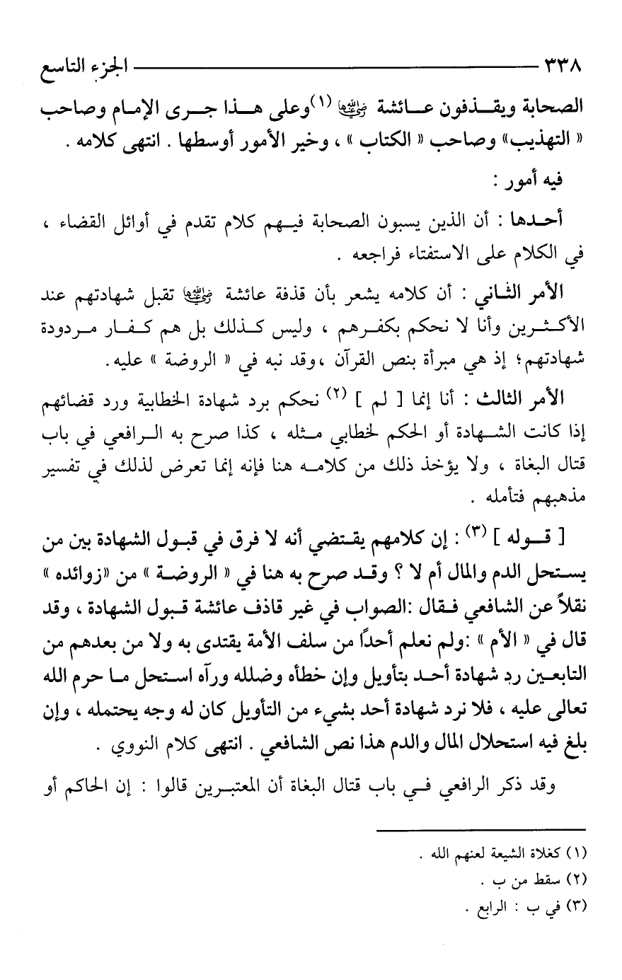 الأمر الثاني: أن كلامه يشعر بأن قذفة عائشة -رضي الله عنها- تقبل شهادتهم عند الأكثرين وأنا لا نحكم بكفرهم، وليس كذلك بل هم كفار مردودة شهادتهم؛ إذ هي مبرأة بنص القرآن، وقد نبه في "الروضة" عليه.