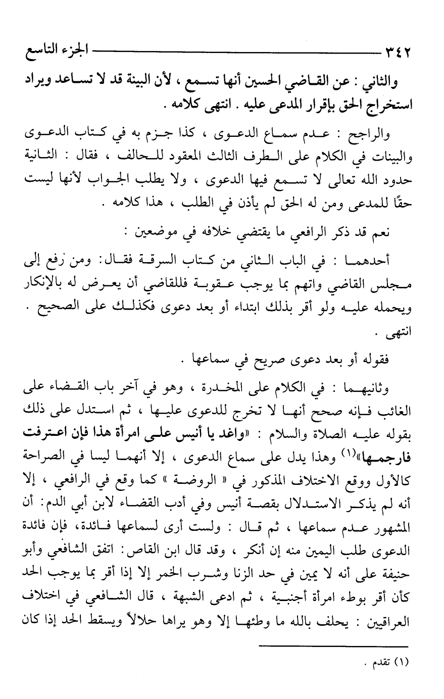 وثانيهما: في الكلام على المخدرة، وهو في آخر باب القضاء على الغائب فإنه صحح أنها لا تخرج للدعوى عليها، ثم استدل على ذلك بقوله -عليه الصلاة والسلام-: "واغد يا أنيس على امرأة هذا فإن اعترفت فارجمها" (¬1) وهذا يدل على سماع الدعوى، إلا أنهما ليسا في الصراحة كالأول ووقع الاختلاف المذكور في "الروضة" كما وقع في الرافعي، إلا أنه لم يذكر الاستدلال بقصة أنيس وفي أدب القضاء لابن أبي الدم: أن المشهور عدم سماعها، ثم قال: ولست أرى لسماعها فائدة، فإن فائدة الدعوى طلب اليمين منه إن أنكر، وقد قال ابن القاص: اتفق الشافعي وأبو حنيفة على أنه لا يمين في حد الزنا وشرب الخمر إلا إذا أقر بما يوجب الحد كأن أقر بوطء امرأة أجنبية، ثم ادعى الشبهة، قال الشافعي في اختلاف العراقيين: يحلف بالله ما وطئها إلا وهو يراها حلالًا ويسقط الحد إذا كان