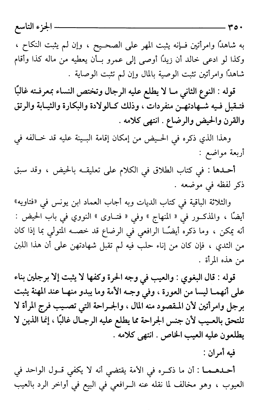 قوله: قال البغوي: والعيب في وجه الحرة وكفها لا يثبت إلا برجلين بناء على أنهما ليسا من العورة، وفي وجه الأمة وما يبدو منها عند المهنة يثبت برجل وامرأتين لأن المقصود منه المال، والجراحة التي تصيب فرج المرأة لا تلتحق بالعيب لأن جنس الجراحة مما يطلع عليه الرجال غالبًا، إنما الذين لا يطلعون عليه العيب الخاص. انتهى كلامه.