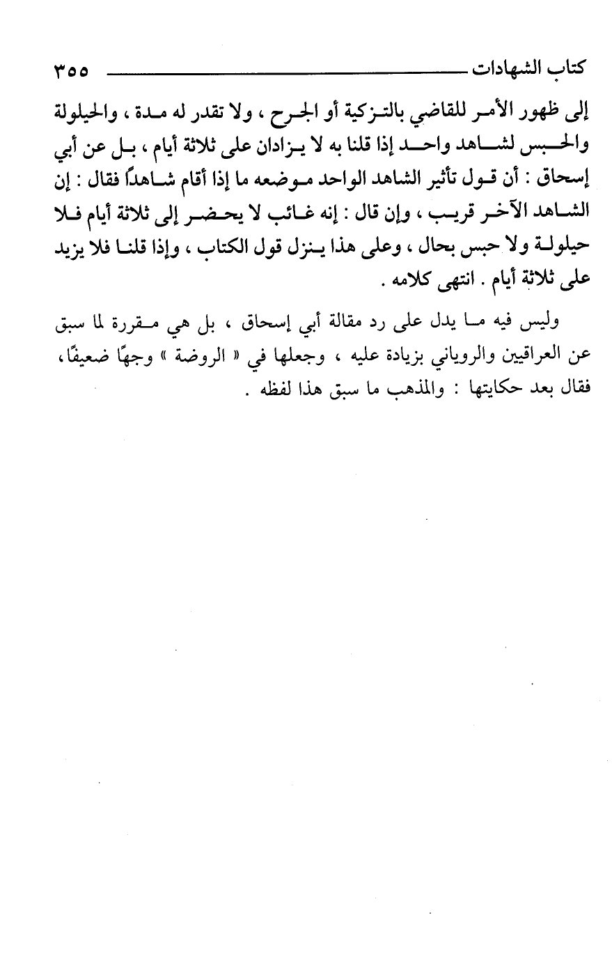 إلى ظهور الأمر للقاضي بالتزكية أو الجرح، ولا تقدر له مدة، والحيلولة والحبس لشاهد واحد إذا قلنا به لا يزادان على ثلاثة أيام، بل عن أبي إسحاق: أن قول تأثير الشاهد الواحد موضعه ما إذا أقام شاهدًا فقال: إن الشاهد الآخر قريب، وإن قال: إنه غائب لا يحضر إلى ثلاثة أيام فلا حيلولة ولا حبس بحال، وعلى هذا ينزل قول الكتاب، وإذا قلنا فلا يزيد على ثلاثة أيام. انتهى كلامه.