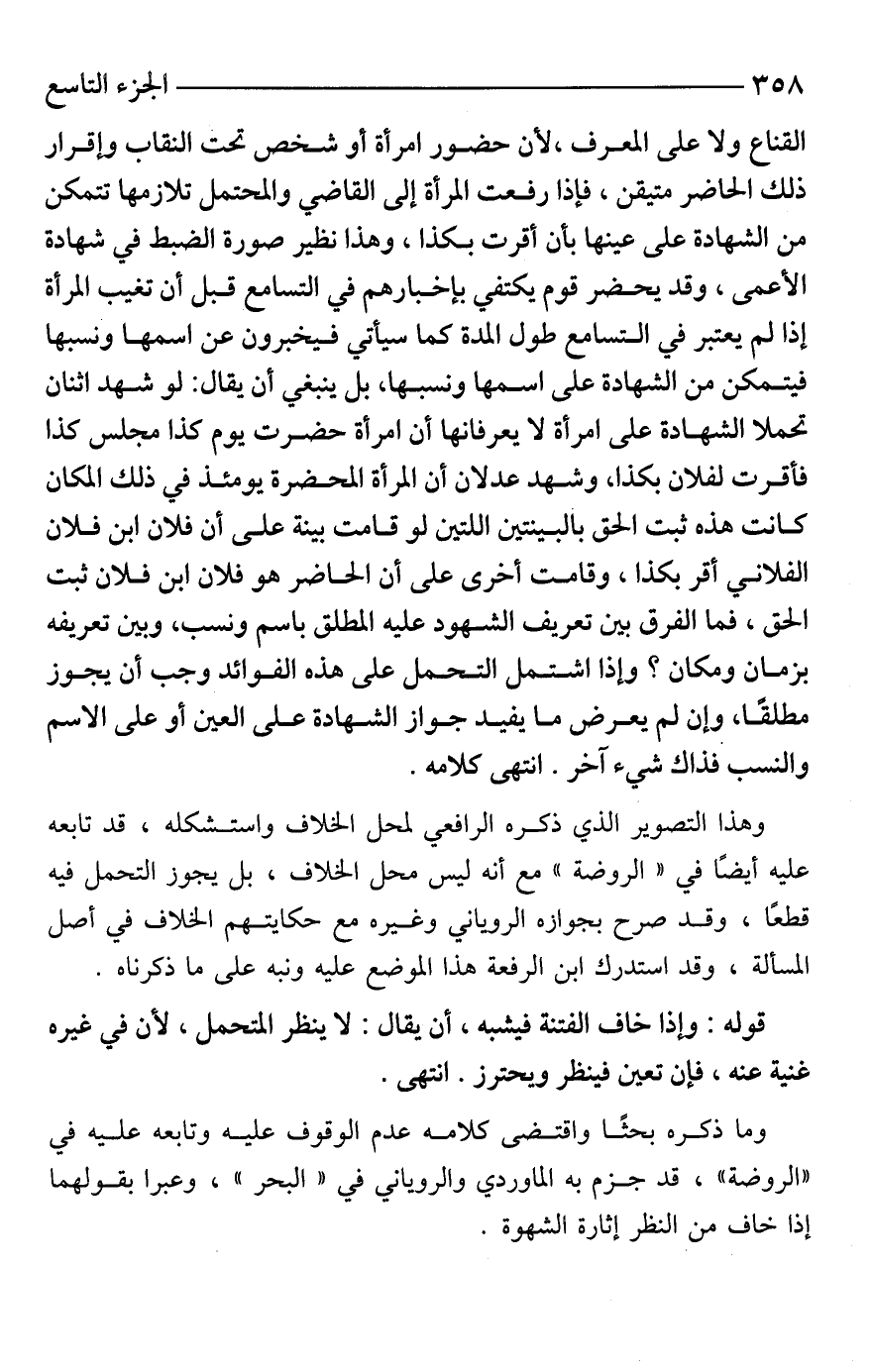 القناع ولا على المعرف، لأن حضور امرأة أو شخص تحت النقاب وإقرار ذلك الحاضر متيقن، فإذا رفعت المرأة إلى القاضي والمحتمل تلازمها تتمكن من الشهادة على عينها بأن أقرت بكذا، وهذا نظير صورة الضبط في شهادة الأعمى، وقد يحضر قوم يكتفي بإخبارهم في التسامع قبل أن تغيب المرأة إذا لم يعتبر في التسامع طول المدة كما سيأتي فيخبرون عن اسمها ونسبها فيتمكن من الشهادة على اسمها ونسبها، بل ينبغي أن يقال: لو شهد اثنان تحملا الشهادة على امرأة لا يعرفانها أن امرأة حضرت يوم كذا مجلس كذا فأقرت لفلان بكذا، وشهد عدلان أن المرأة المحضرة يومئذ في ذلك المكان كانت هذه ثبت الحق بالبينتين اللتين لو قامت بينة على أن فلان ابن فلان الفلاني أقر بكذا، وقامت أخرى على أن الحاضر هو فلان ابن فلان ثبت الحق، فما الفرق بين تعريف الشهود عليه المطلق باسم ونسب، وبين تعريفه بزمان ومكان؟ وإذا اشتمل التحمل على هذه الفوائد وجب أن يجوز مطلقًا، وإن لم يعرض ما يفيد جواز الشهادة على العين أو على الاسم والنسب فذاك شيء آخر. انتهى كلامه.