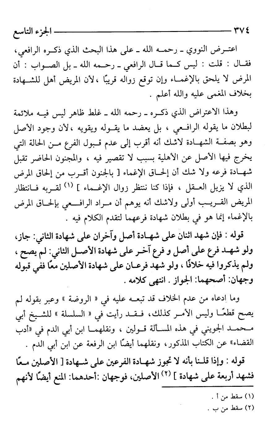 وهذا الاعتراض الذي ذكره -رحمه الله- غلط ظاهر ليس فيه ملائمة لبطلان ما يقوله الرافعي، بل يعضد ما يقوله ويقويه، لأن وجود الأصل وهو بصفة الشهادة لا شك أنه أقرب إلى عدم قبول الفرع من الحالة التي يخرج فيها الأصل عن الأهلية بسبب لا تقصير فيه، والمجنون الحاضر تقبل شهادة فرعه ولا شك أن إلحاق الإغماء [بالجنون أقرب من إلحاق المرض الذي لا يزيل العقل، فإذا كنا ننتظر زوال الإغماء] (¬1) لقربه فانتظار المريض القريب أولى ولا شك أنه يوهم أن مراد الرافعي بإلحاق المرض بالإغماء إنما هو في بطلان شهادة فرعهما لتقدم الكلام فيه.