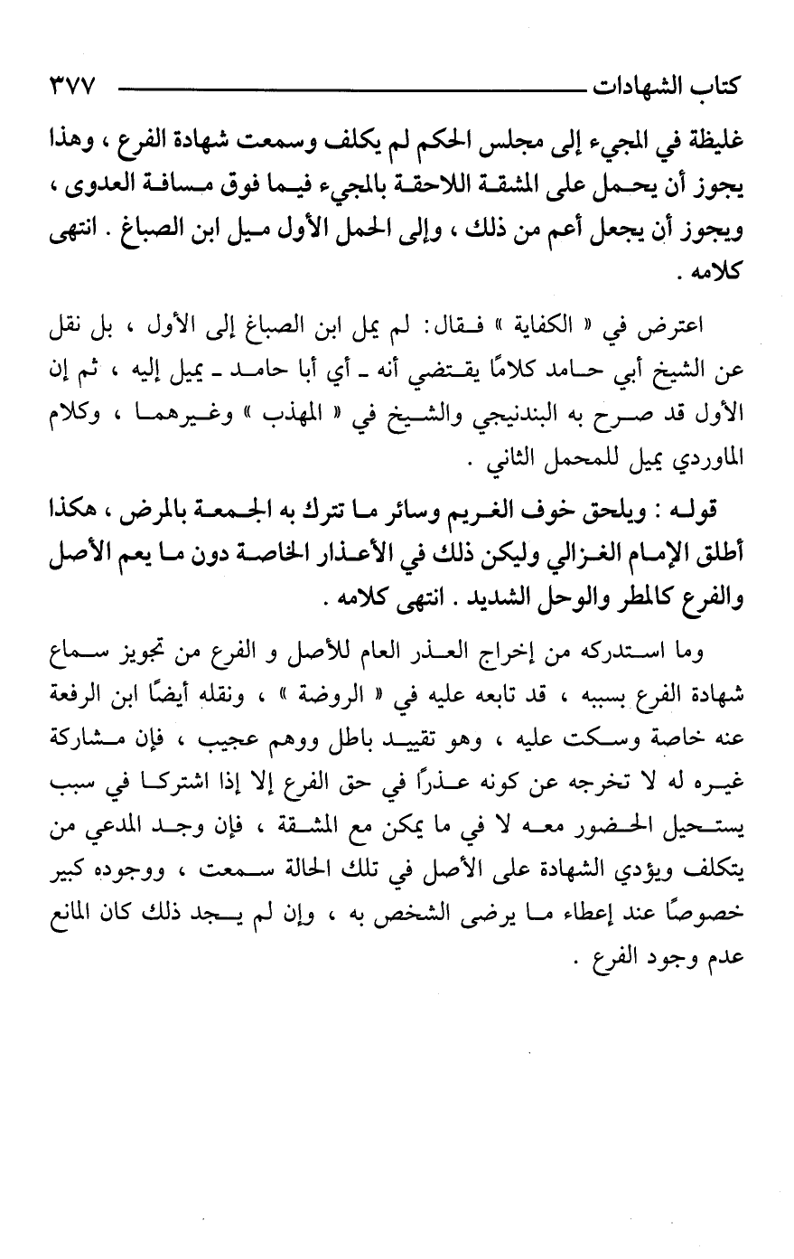 وما استدركه من إخراج العذر العام للأصل والفرع من تجويز سماع شهادة الفرع بسببه، قد تابعه عليه في "الروضة"، ونقله أيضًا ابن الرفعة عنه خاصة وسكت عليه، وهو تقييد باطل ووهم عجيب، فإن مشاركة غيره له لا تخرجه عن كونه عذرًا في حق الفرع إلا إذا اشتركا في سبب يستحيل الحضور معه لا في ما يمكن مع المشقة، فإن وجد المدعي من يتكلف ويؤدي الشهادة على الأصل في تلك الحالة سمعت، ووجوده كبير خصوصًا عند إعطاء ما يرضى الشخص به، وإن لم يجد ذلك كان المانع عدم وجود الفرع.