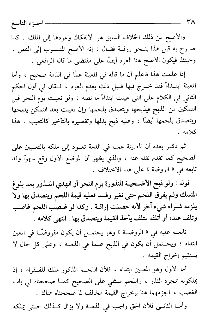 إذا علمت هذا فاعلم أن ما قاله في المعينة عمّا في الذمة صحيح، وأما المعينة ابتداءً فقد خرج فيها قبل ذلك بعدم العود، فقال في أول الحكم الثاني في الكلام على التي عينت ابتداءً ما نصه: ولو تعيبت يوم النحر قبل التمكين من الذبح فيذبحها ويتصدق بلحمها وإن تعيبت بعد التمكن يذبحها ويتصدق بلحمها أيضًا، وعليه ذبح بدلها وتقصيره بالتأخير كالتعيب. هذا كلامه.