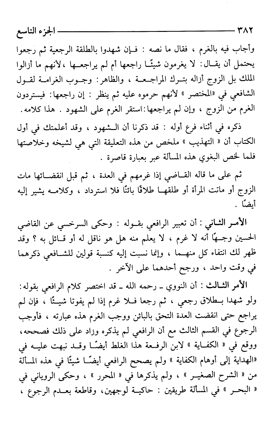 الأمر الثالث: أن النووي -رحمه الله- قد اختصر كلام الرافعي بقوله: ولو شهدا بطلاق رجعي، ثم رجعا فلا غرم إذا لم يفوتا شيئًا، فإن لم يراجع حتى انقضت العدة التحق بالبائن ووجب الغرم هذه عبارته، فأوجب الرجوع في القسم الثالث مع أن الرافعي لم يذكره وزاد على ذلك فصححه، ووقع في "الكفاية" لابن الرفعة هذا الغلط أيضًا وقد نبهت عليه في "الهداية إلى أوهام الكفاية" ولم يصحح الرافعي أيضًا شيئًا في هذه المسألة من "الشرح الصغير"، ولم يذكرها في "المحرر"، وحكى الروياني في "البحر" في المسألة طريقين: حاكية لوجهين، وقاطعة بعدم الرجوع،