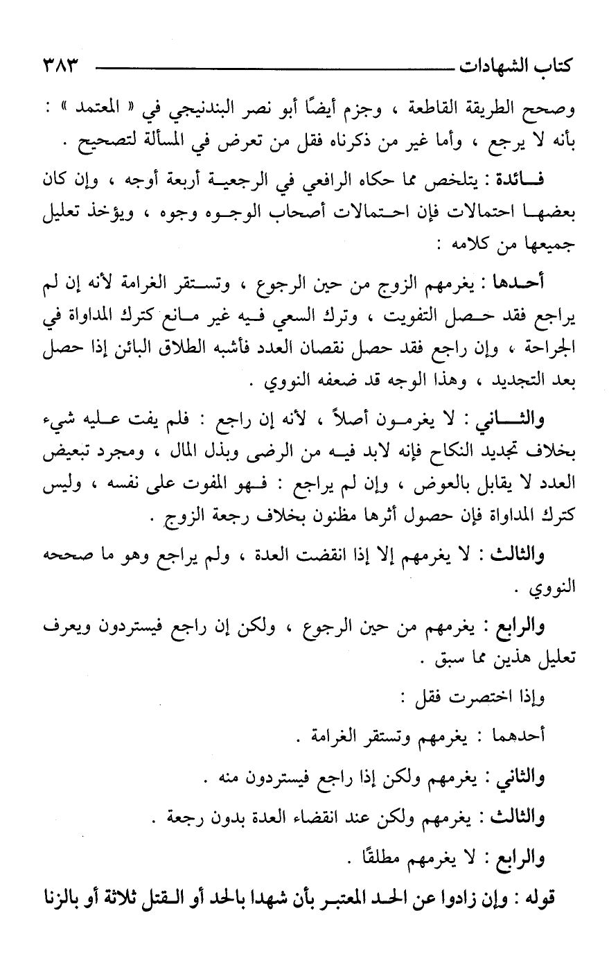 فائدة: يتلخص مما حكاه الرافعي في الرجعية أربعة أوجه، وإن كان بعضها احتمالات فإن احتمالات أصحاب الوجوه وجوه، ويؤخذ تعليل جميعها من كلامه: