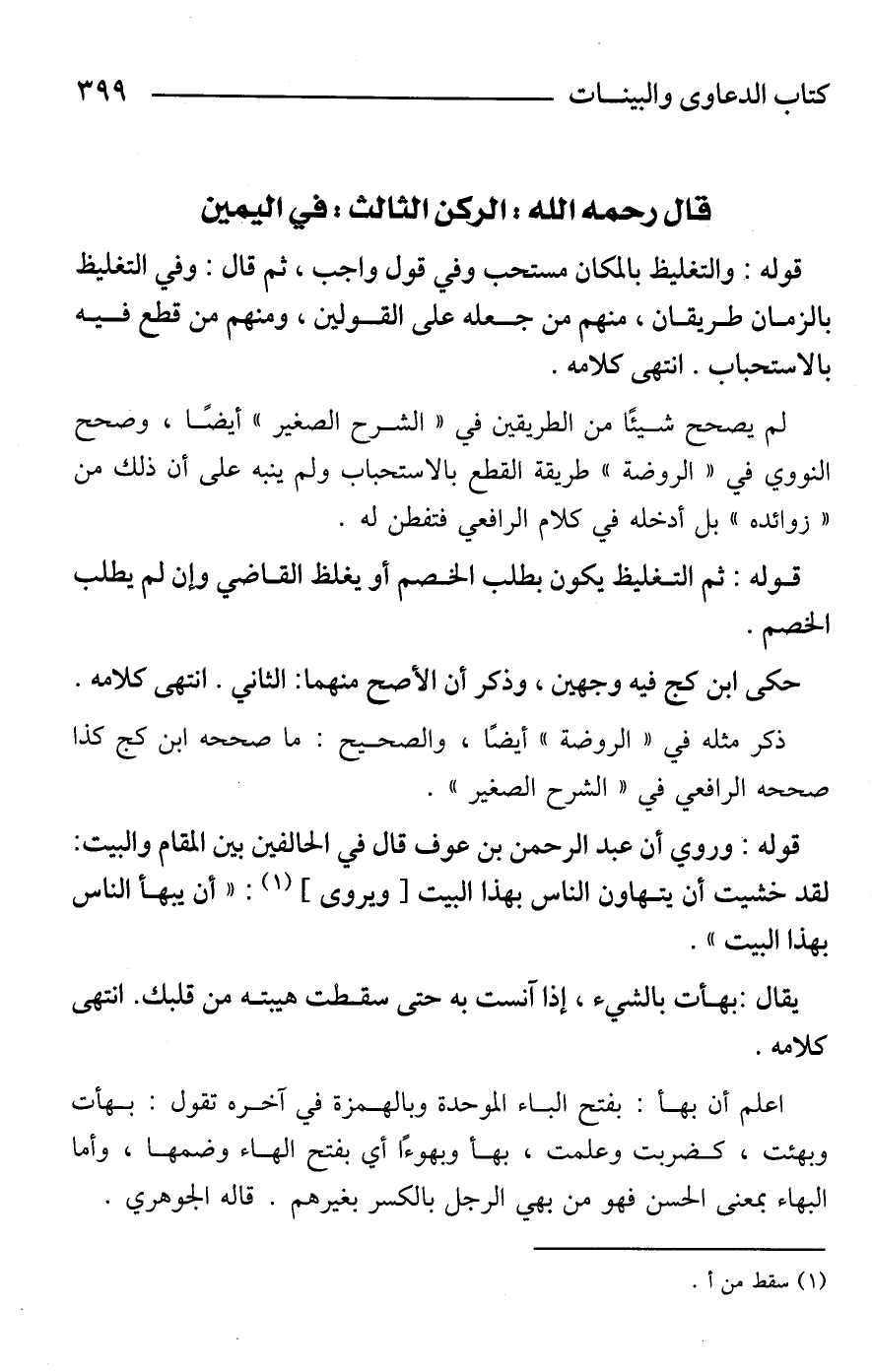قوله: والتغليظ بالمكان مستحب وفي قول واجب، ثم قال: وفي التغليظ بالزمان طريقان، منهم من جعله على القولين، ومنهم من قطع فيه بالاستحباب. انتهى كلامه.