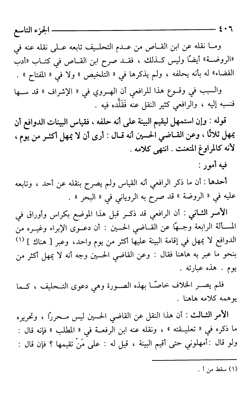 الأمر الثاني: أن الرافعي قد ذكر قبل هذا الموضع بكراس وأوراق في المسألة الرابعة وجهًا عن القاضي الحسين: أن دعوى الإبراء وغيره من الدوافع لا يمهل في إقامة البينة عليها أكثر من يوم واحد، وعبر [هناك] (¬1) بنحو ما عبر به هاهنا فقال: وعن القاضي الحسين وجه أنه لا يمهل أكثر من يوم. هذه عبارته.