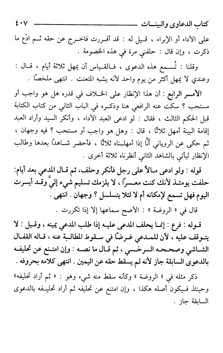 الأمر الرابع: أن هذا الإنظار على الخلاف في قدره هل هو واجب أو مستحب؟ سكت عنه الرافعي هنا وذكره في الباب الثاني من كتاب الكتابة قبل الحكم الثالث، فقال: لو ادعى العبد الأداء، وأنكر السيد وأراد العبد إقامة البينة أمهل ثلاثًا، قال: وهل هو واجب أو مستحب؟ فيه وجهان، ثم حكى عن الروياني أنَّا إذا أمهلناه ثلاثًا، فأحضر شاهدًا بعدها وطالب الإنظار ليأتي بالشاهد الثاني أنظرناه ثلاثة أخرى.
