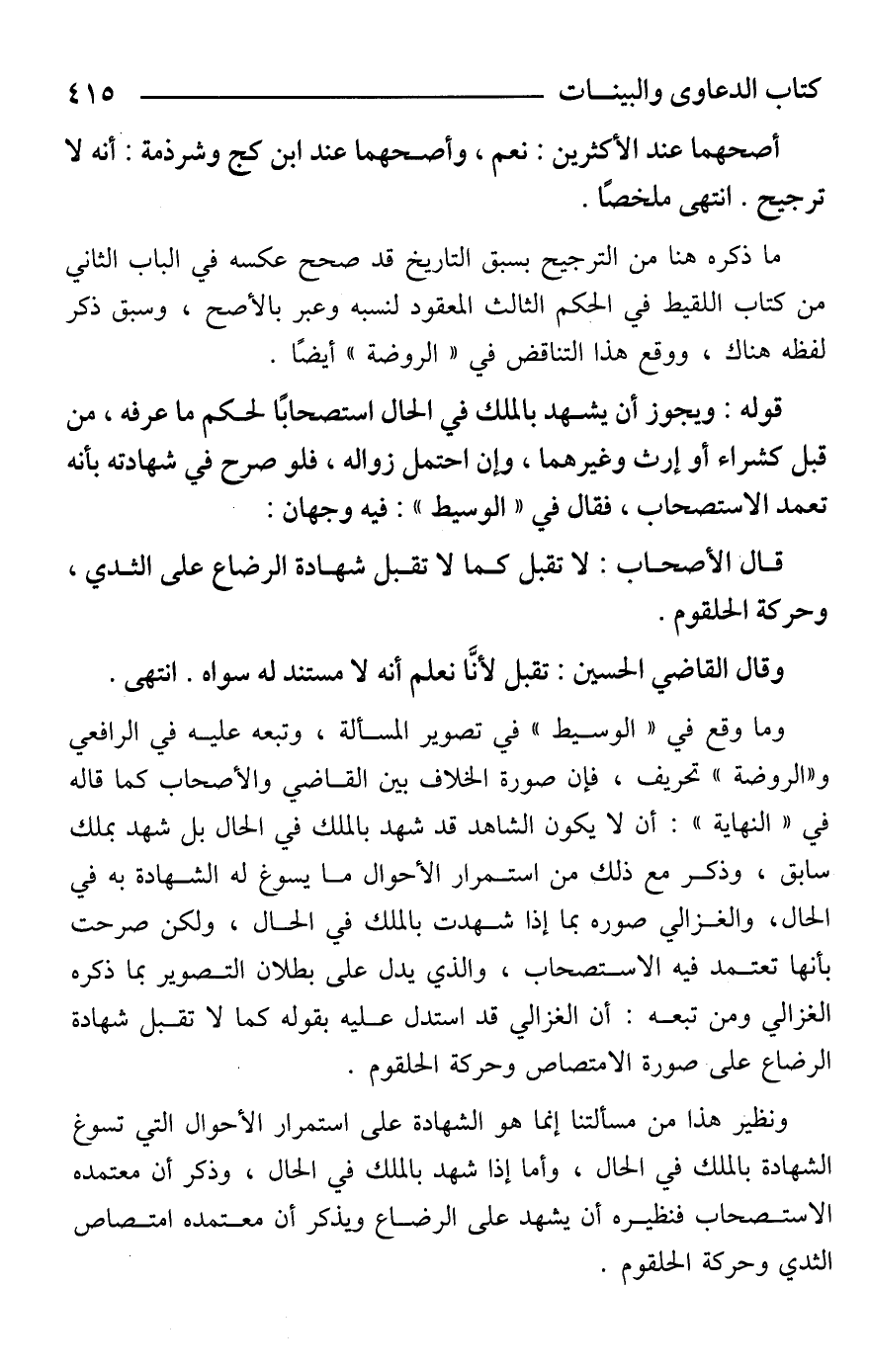 وما وقع في "الوسيط" في تصوير المسألة، وتبعه عليه في الرافعي و"الروضة" تحريف، فإن صورة الخلاف بين القاضي والأصحاب كما قاله في "النهاية": أن لا يكون الشاهد قد شهد بالملك في الحال بل شهد بملك سابق، وذكر مع ذلك من استمرار الأحوال ما يسوغ له الشهادة به في الحال، والغزالي صوره بما إذا شهدت بالملك في الحال، ولكن صرحت بأنها تعتمد فيه الاستصحاب، والذي يدل على بطلان التصوير بما ذكره الغزالي ومن تبعه: أن الغزالي قد استدل عليه بقوله كما لا تقبل شهادة الرضاع على صورة الامتصاص وحركة الحلقوم.
