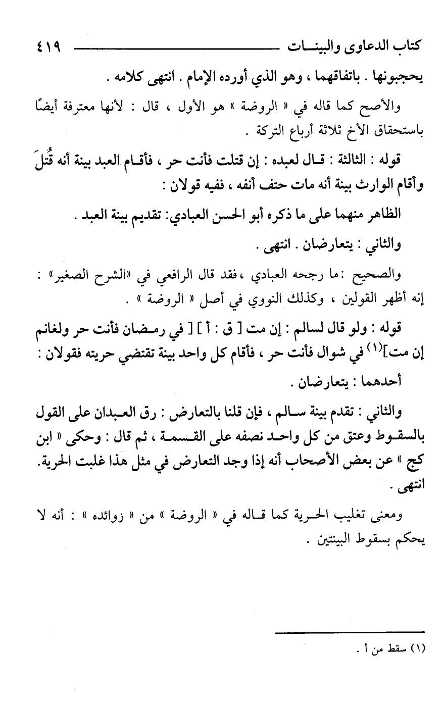 ومعنى تغليب الحرية كما قاله في "الروضة" من "زوائده": أنه لا يحكم بسقوط البينتين.
