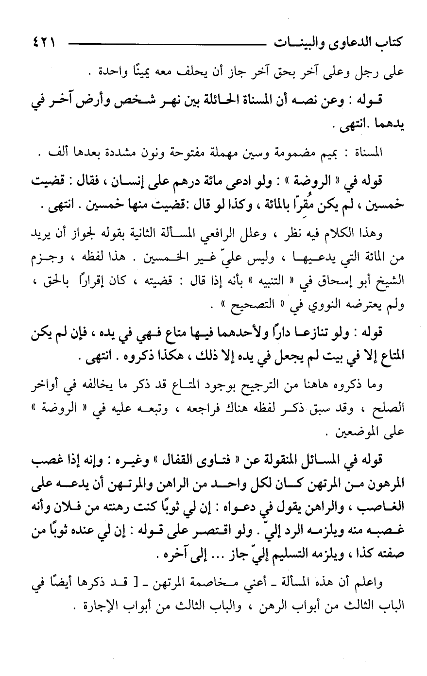قوله: وعن نصه أن المسناة الحائلة بين نهر شخص وأرض آخر في يدهما. انتهى.