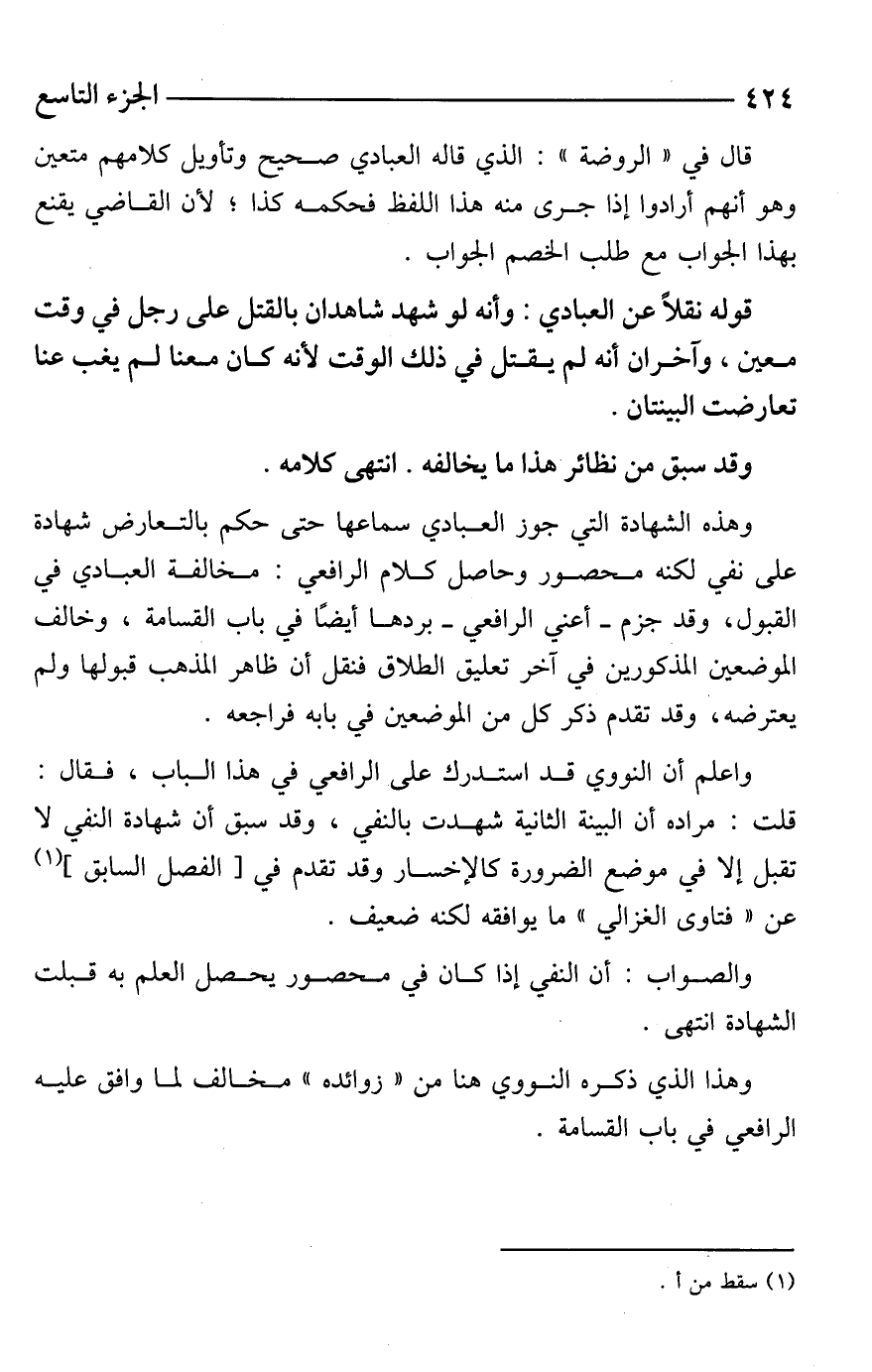 وهذه الشهادة التي جوز العبادي سماعها حتى حكم بالتعارض شهادة على نفي لكنه محصور وحاصل كلام الرافعي: مخالفة العبادي في القبول، وقد جزم -أعني الرافعي- بردها أيضًا في باب القسامة، وخالف الموضعين المذكورين في آخر تعليق الطلاق فنقل أن ظاهر المذهب قبولها ولم يعترضه، وقد تقدم ذكر كل من الموضعين في بابه فراجعه.