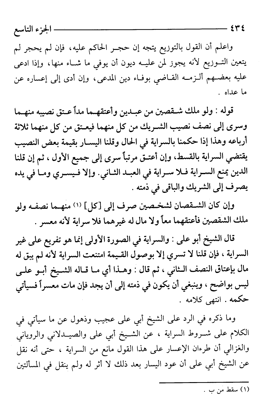 وما ذكره في الرد على الشيخ أبي على عجيب وذهول عن ما سيأتي في الكلام على شروط السراية، عن الشيخ أبي على والصيدلاني والروياني والغزالي أن طرءان الإعسار على هذا القول مانع من السراية، حتى أنه نقل عن الشيخ أبي على أن عود اليسار بعد ذلك لا أثر له ولم ينقل في المسألتين
