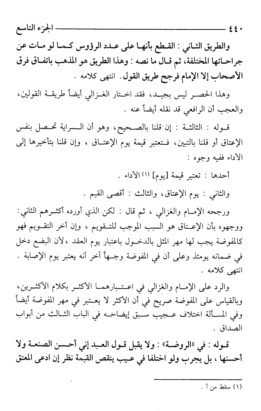 ورجحه الإمام والغزالي، ثم قال: لكن الذي أورده أكثرهم الثاني: ووجهوه بأن الإعتاق هو السبب الموجب للتقويم، وإن أخر التقويم فهو كالمفوضة يجب لها مهر المثل بالدخول باعتبار يوم العقد، لأن البضع دخل في ضمانه يومئذ وعلى أن في المفوضة وجهًا آخر أنه يعتبر يوم الإصابة. انتهى كلامه.