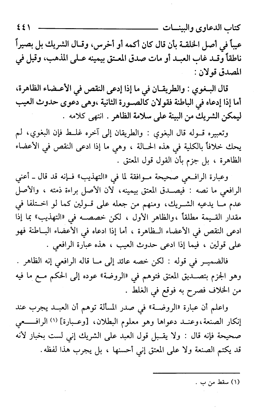 قال البغوي: والطريقان في ما إذا إدعى النقص في الأعضاء الظاهرة، أما إذا إدعاه في الباطنة فقولان كالصورة الثانية، وهى دعوى حدوث العيب ليمكن الشريك من البينة على سلامة الظاهر. انتهى كلامه.