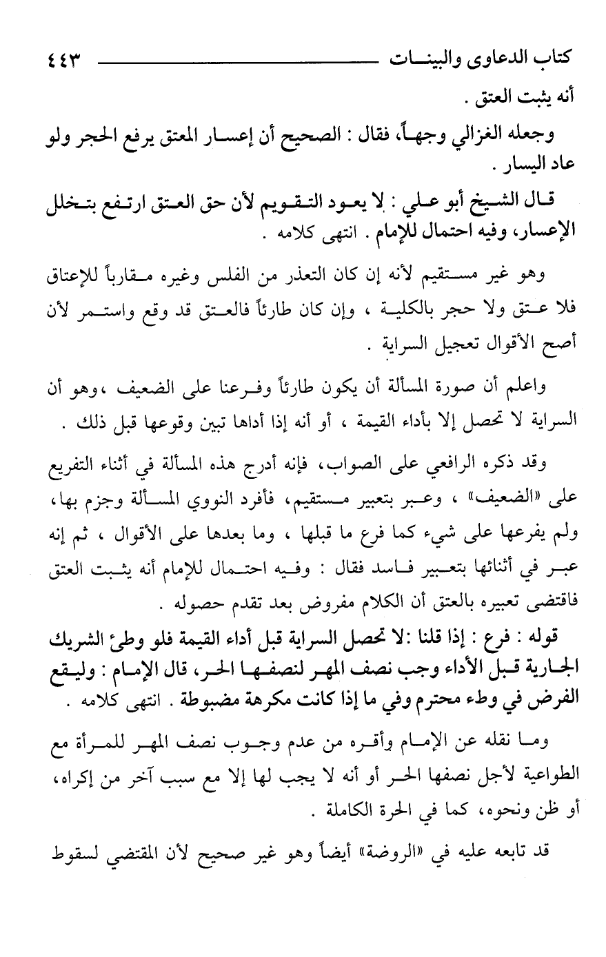 وقد ذكره الرافعي على الصواب، فإنه أدرج هذه المسألة في أثناء التفريع على "الضعيف"، وعبر بتعبير مستقيم، فأفرد النووي المسألة وجزم بها، ولم يفرعها على شيء كما فرع ما قبلها، وما بعدها على الأقوال، ثم إنه عبر في أثنائها بتعبير فاسد فقال: وفيه احتمال للإمام أنه يثبت العتق فاقتضى تعبيره بالعتق أن الكلام مفروض بعد تقدم حصوله.