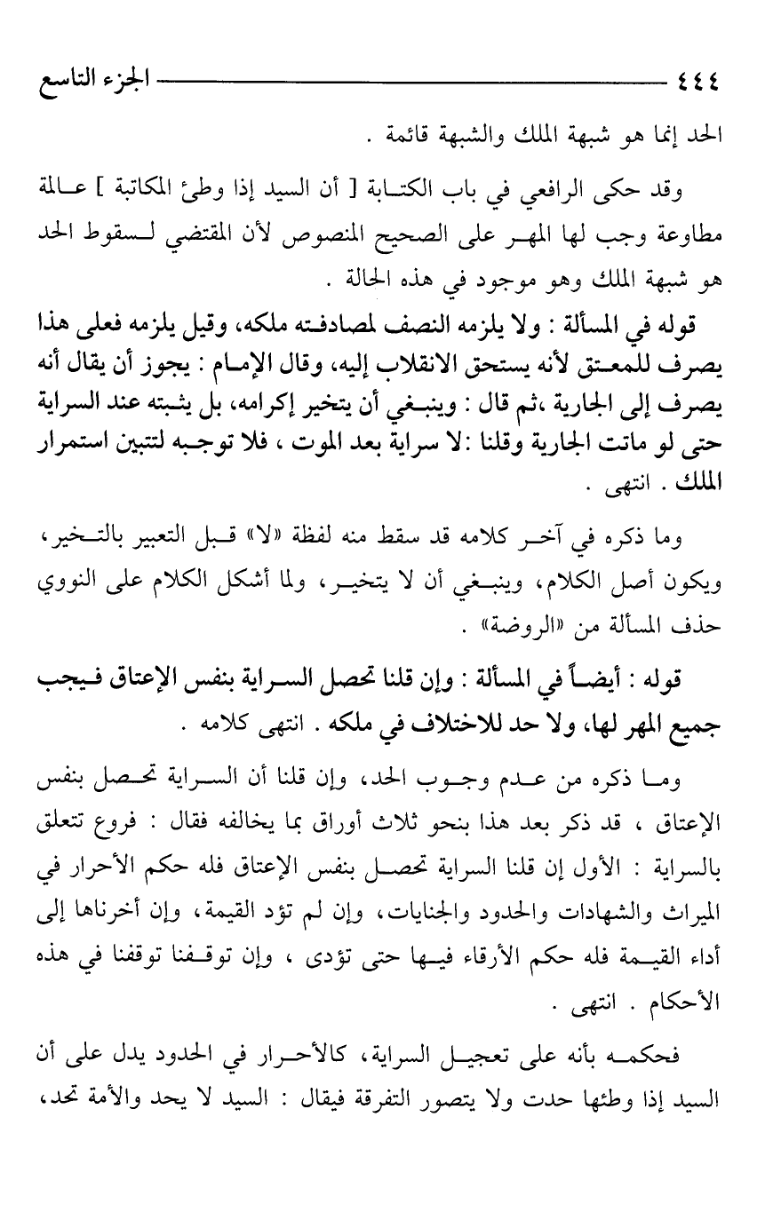 وما ذكره من عدم وجوب الحد، وإن قلنا أن السراية تحصل بنفس الإعتاق، قد ذكر بعد هذا بنحو ثلاث أوراق بما يخالفه فقال: فروع تتعلق بالسراية: الأول إن قلنا السراية تحصل بنفس الإعتاق فله حكم الأحرار في الميراث والشهادات والحدود والجنايات، وإن لم تؤد القيمة، وإن أخرناها إلى أداء القيمة فله حكم الأرقاء فيها حتى تؤدى، وإن توقفنا توقفنا في هذه الأحكام. انتهى.