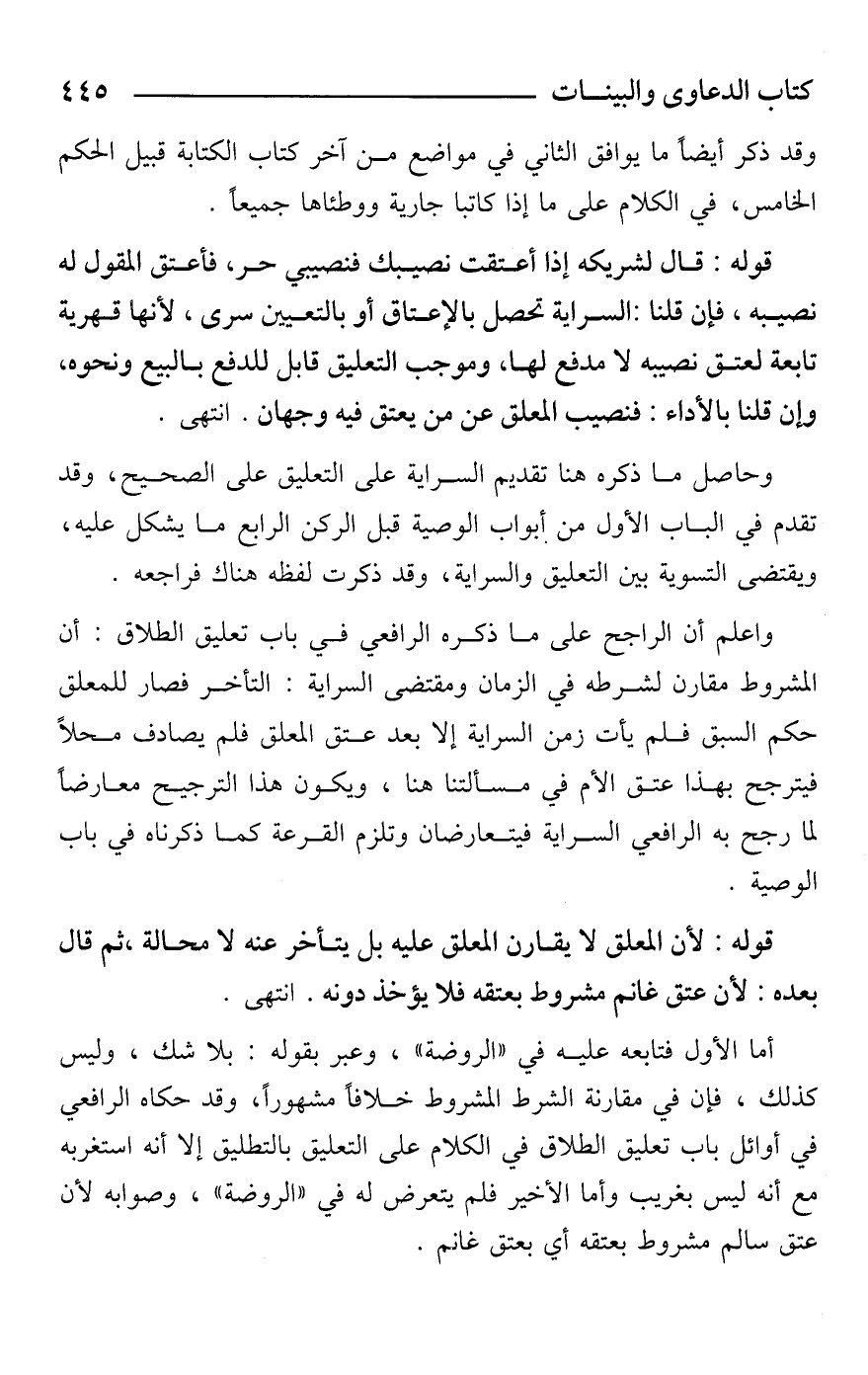 واعلم أن الراجح على ما ذكره الرافعي في باب تعليق الطلاق: أن المشروط مقارن لشرطه في الزمان ومقتضى السراية: التأخر فصار للمعلق حكم السبق فلم يأت زمن السراية إلا بعد عتق المعلق فلم يصادف محلًا فيترجح بهذا عتق الأم في مسألتنا هنا، ويكون هذا الترجيح معارضًا لما رجح به الرافعي السراية فيتعارضان وتلزم القرعة كما ذكرناه في باب الوصية.