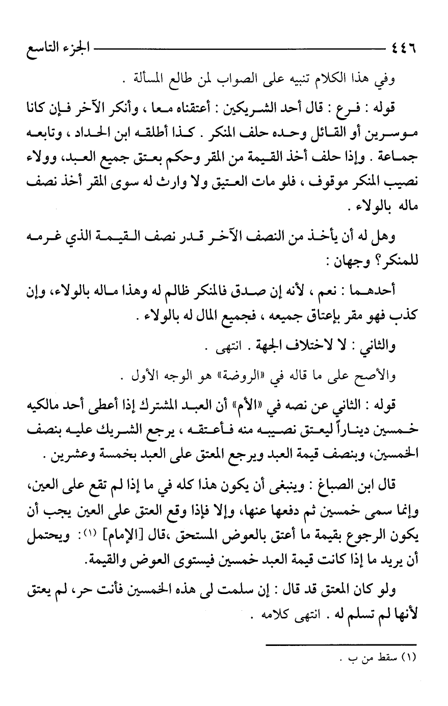قوله: فرع: قال أحد الشريكين: أعتقناه معا، وأنكر الآخر فإن كانا موسرين أو القائل وحده حلف المنكر. كذا أطلقه ابن الحداد، وتابعه جماعة. وإذا حلف أخذ القيمة من المقر وحكم بعتق جميع العبد، وولاء نصيب المنكر موقوف، فلو مات العتيق ولا وارث له سوى المقر أخذ نصف ماله بالولاء.