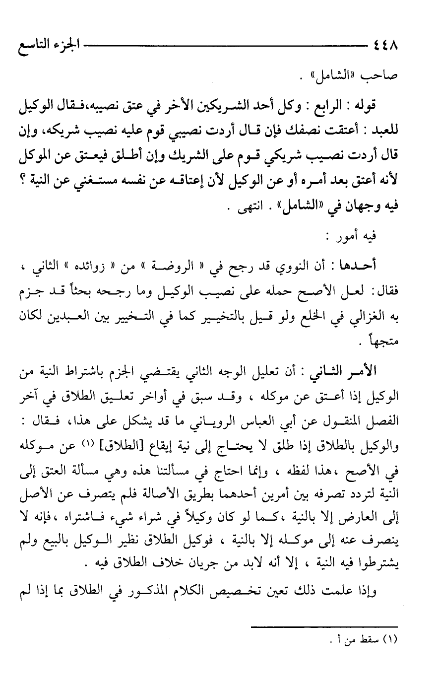 الأمر الثاني: أن تعليل الوجه الثاني يقتضي الجزم باشتراط النية من الوكيل إذا أعتق عن موكله، وقد سبق في أواخر تعليق الطلاق في آخر الفصل المنقول عن أبي العباس الروياني ما قد يشكل على هذا، فقال: والوكيل بالطلاق إذا طلق لا يحتاج إلى نية إيقاع [الطلاق] (¬1) عن موكله في الأصح، هذا لفظه، وإنما احتاج في مسألتنا هذه وهي مسألة العتق إلى النية لتردد تصرفه بين أمرين أحدهما بطريق الأصالة فلم يتصرف عن الأصل إلى العارض إلا بالنية، كما لو كان وكيلًا في شراء شيء فاشتراه، فإنه لا ينصرف عنه إلى موكله إلا بالنية، فوكيل الطلاق نظير الوكيل بالبيع ولم يشترطوا فيه النية، إلا أنه لابد من جريان خلاف الطلاق فيه.