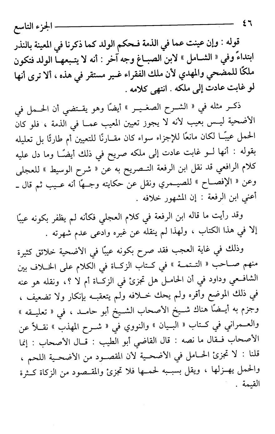 وذلك في غاية العجب فقد صرح بكونه عيبًا في الأضحية خلائق كثيرة منهم صاحب "التتمة" في كتاب الزكاة في الكلام على الخلاف بين الشافعي وداود في أن الحامل هل تجزئ في الزكاة أم لا؟ ، ونقله هو عنه في ذلك الموضع وأقره ولم يحك خلافه ولم يتعقبه بإنكار ولا تضعيف، وجزم به أيضًا هناك شيخ الأصحاب الشيخ أبو حامد، في "تعليقه" والعمراني في كتاب "البيان" والنووي في "شرح المهذب" نقلًا عن الأصحاب فقال ما نصه: قال القاضي أبو الطيب: قال الأصحاب: إنما قلنا: لا تجزئ الحامل في الأضحية لأن المقصود من الأضحية اللحم، والحمل يهزلها، ويقل بسببه لحمها فلا تجزئ والمقصود من الزكاة كثرة القيمة.