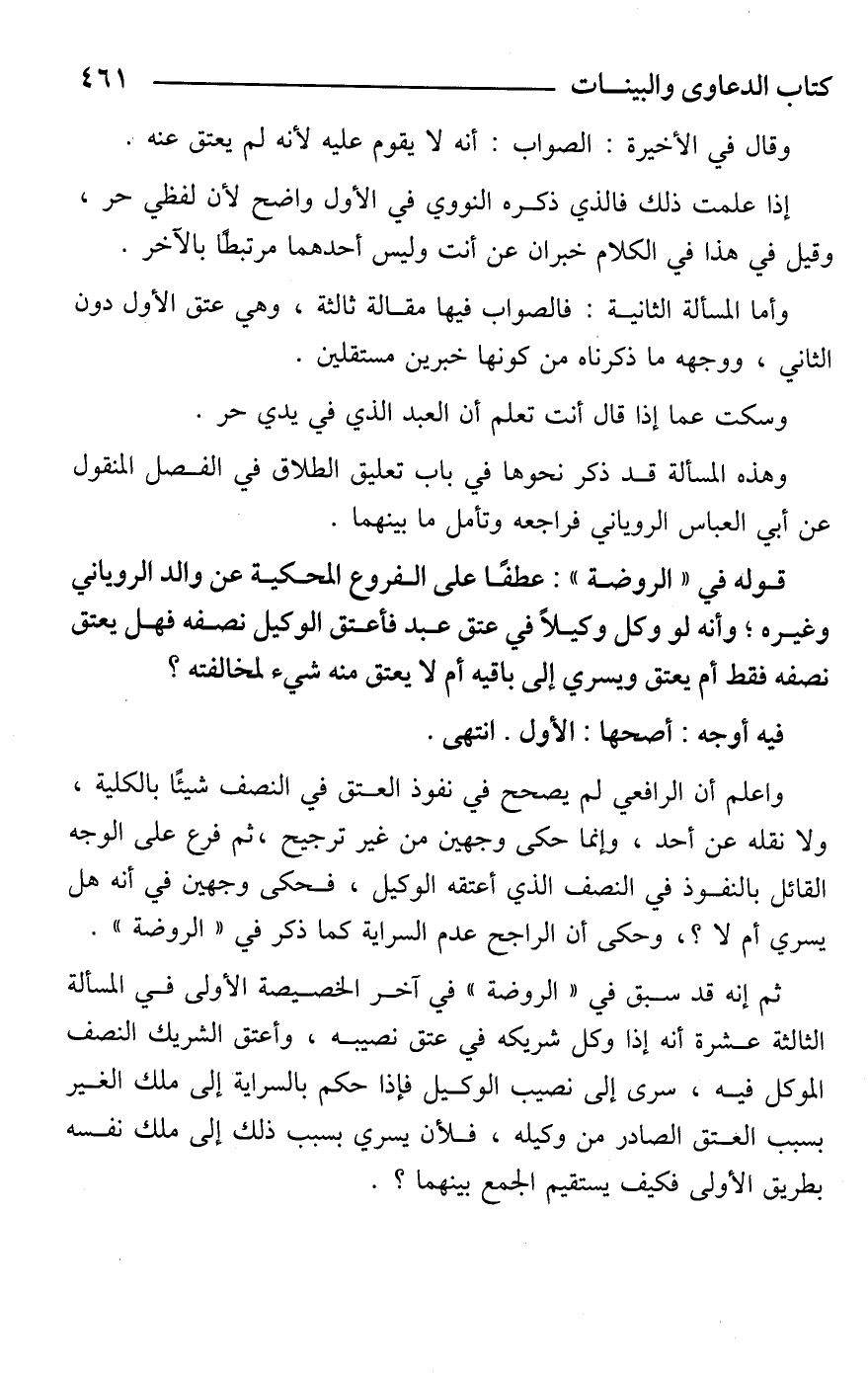 قوله في "الروضة": عطفًا على الفروع المحكية عن والد الروياني وغيره؛ وأنه لو وكل وكيلًا في عتق عبد فأعتق الوكيل نصفه فهل يعتق نصفه فقط أم يعتق ويسري إلى باقيه أم لا يعتق منه شيء لمخالفته؟