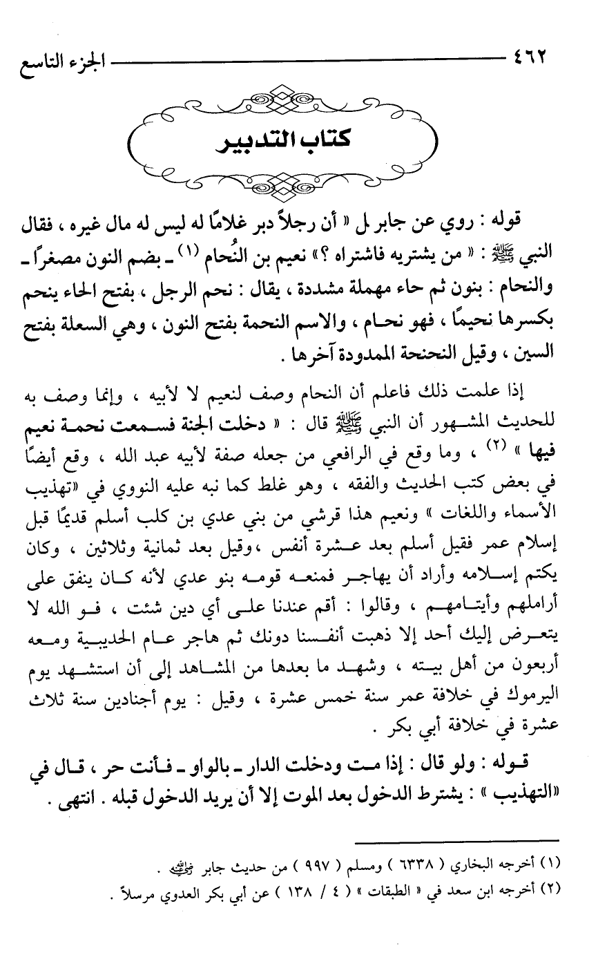 قوله: روي عن جابر "أن رجلًا دبر غلامًا له ليس له مال غيره، فقال النبي - صَلَّى اللَّهُ عَلَيْهِ وَسَلَّمَ -: "من يشتريه فاشتراه؟ " نعيم بن النُحام (¬1) -بضم النون مصغرًا- والنحام: بنون ثم حاء مهملة مشددة، يقال: نحم الرجل، بفتح الحاء ينحم بكسرها. نحيمًا، فهو نحام، والاسم النحمة بفتح النون، وهي السعلة بفتح السين، وقيل النحنحة الممدودة آخرها.