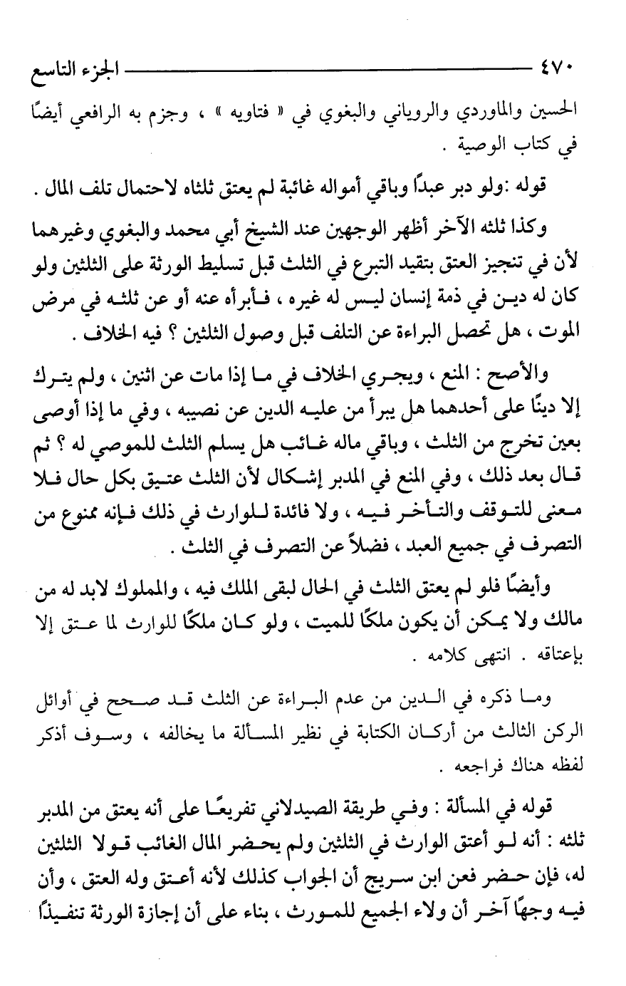 وكذا ثلثه الآخر أظهر الوجهين عند الشيخ أبي محمد والبغوي وغيرهما لأن في تنجيز العتق بتقيد التبرع في الثلث قبل تسليط الورثة على الثلثين ولو كان له دين في ذمة إنسان ليس له غيره، فأبرأه عنه أو عن ثلثه في مرض الموت، هل تحصل البراءة عن التلف قبل وصول الثلثين؟ فيه الخلاف.