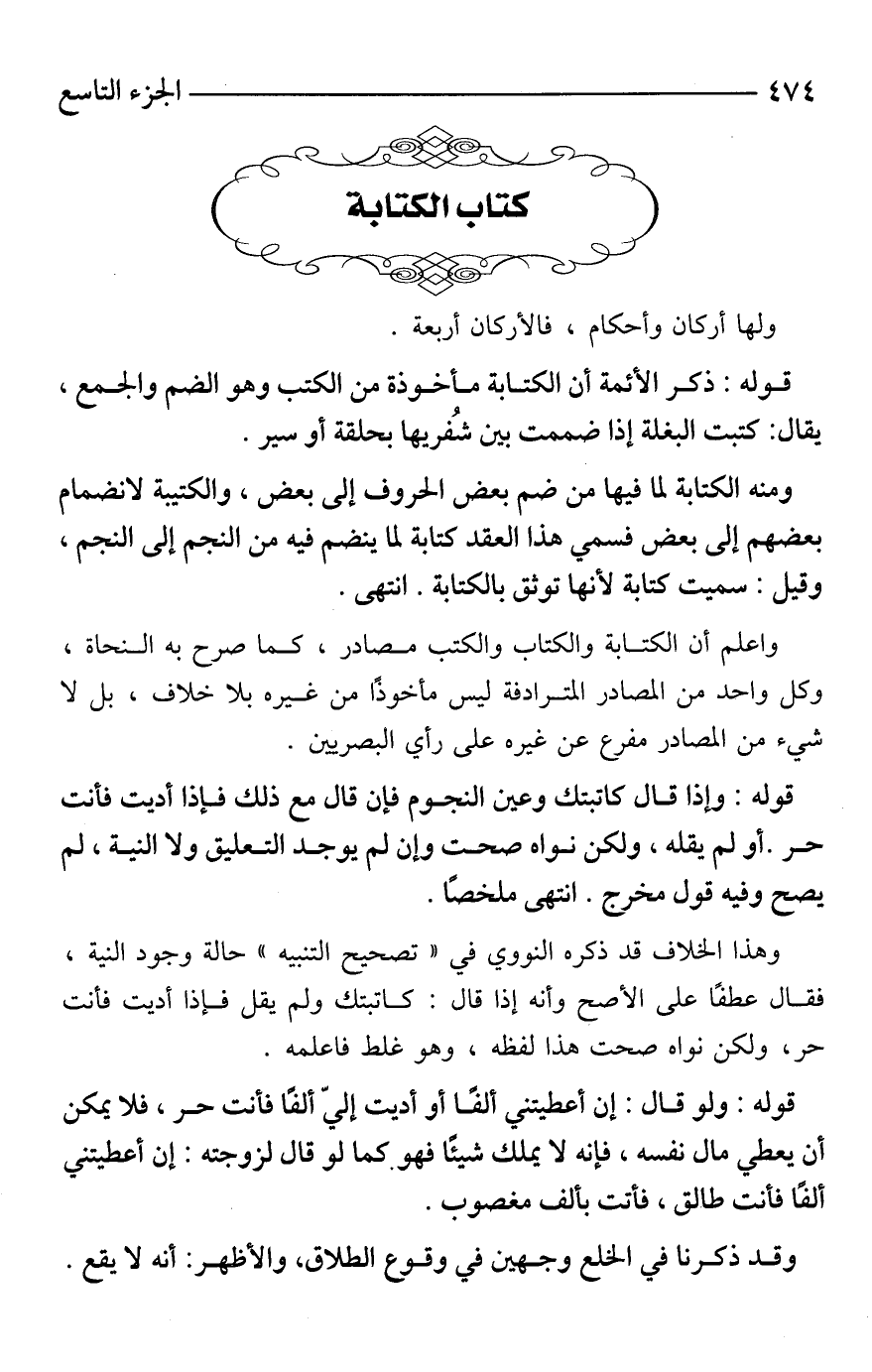 ومنه الكتابة لما فيها من ضم بعض الحروف إلى بعض، والكتيبة لانضمام بعضهم إلى بعض فسمي هذا العقد كتابة لما ينضم فيه من النجم إلى النجم، وقيل: سميت كتابة لأنها توثق بالكتابة. انتهى.