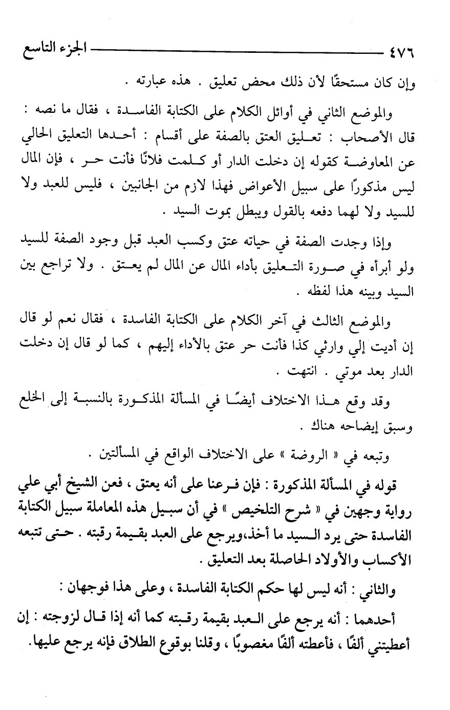 والموضع الثاني في أوائل الكلام على الكتابة الفاسدة، فقال ما نصه: قال الأصحاب: تعليق العتق بالصفة على أقسام: أحدها التعليق الحالي عن المعاوضة كقوله إن دخلت الدار أو كلمت فلانًا فأنت حر، فإن المال ليس مذكورًا على سبيل الأعواض فهذا لازم من الجانبين، فليس للعبد ولا للسيد ولا لهما دفعه بالقول ويبطل بموت السيد.