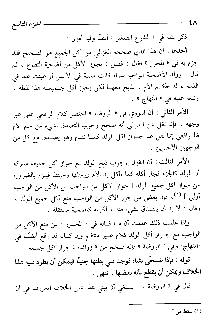 الأمر الثاني: أن النووي في "الروضة" اختصر كلام الرافعي على غير وجهه، فإنه نقل عن الغزالي أنه صحح وجوب التصدق بشيء من لحم الأم فالرافعي إنما نقل عنه جواز أكل الولد كما تقدم وهو يصدق مع كل من الوجهين الأخيرين.