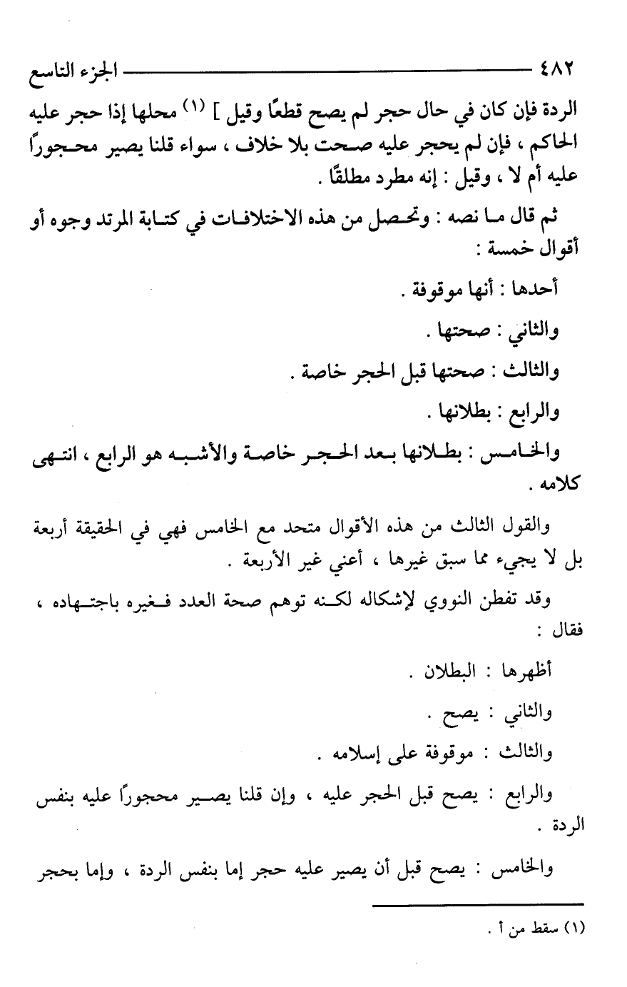 ثم قال ما نصه: وتحصل من هذه الاختلافات في كتابة المرتد وجوه أو أقوال خمسة: