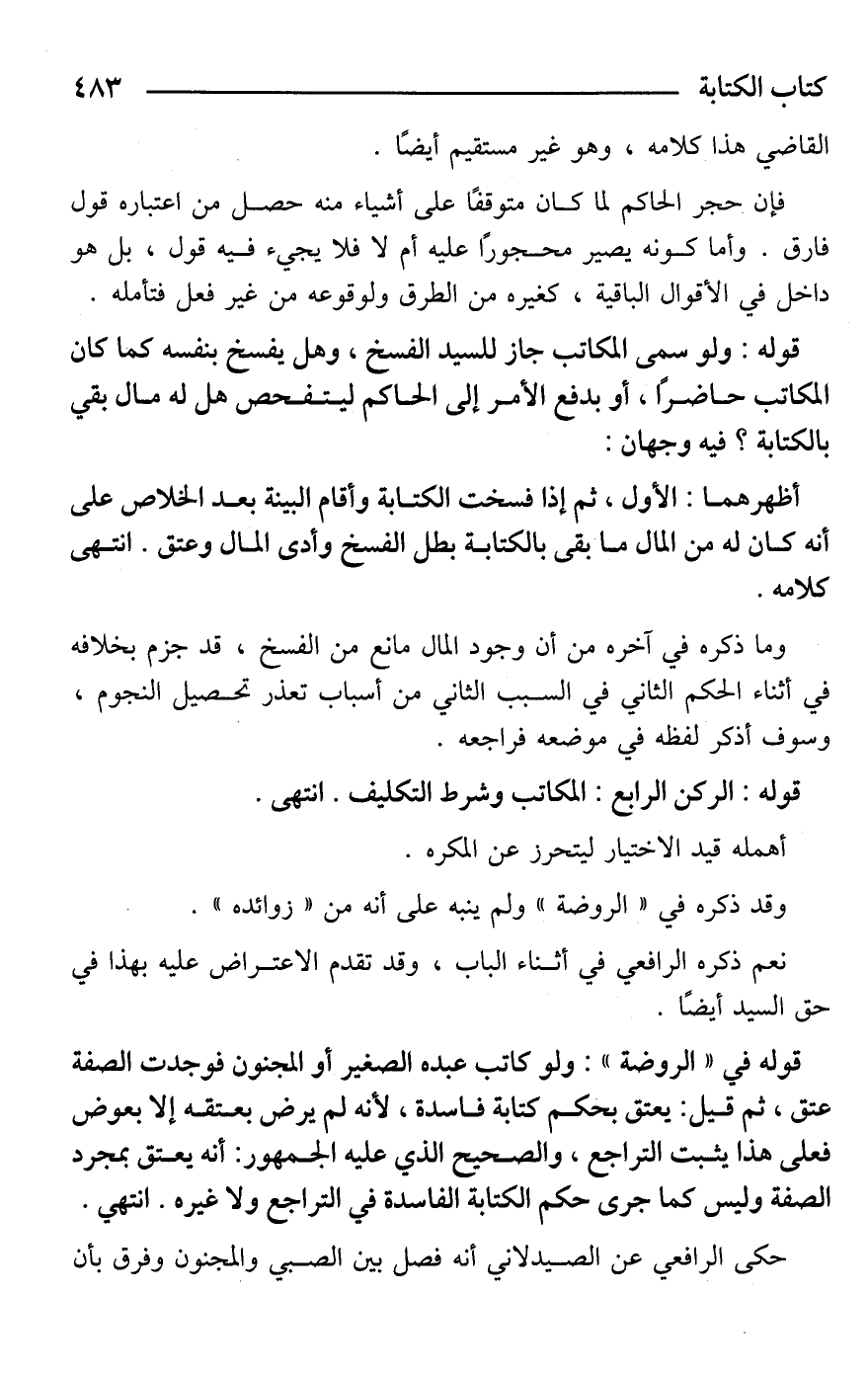وما ذكره في آخره من أن وجود المال مانع من الفسخ، قد جزم بخلافه في أثناء الحكم الثاني في السبب الثاني من أسباب تعذر تحصيل النجوم، وسوف أذكر لفظه في موضعه فراجعه.